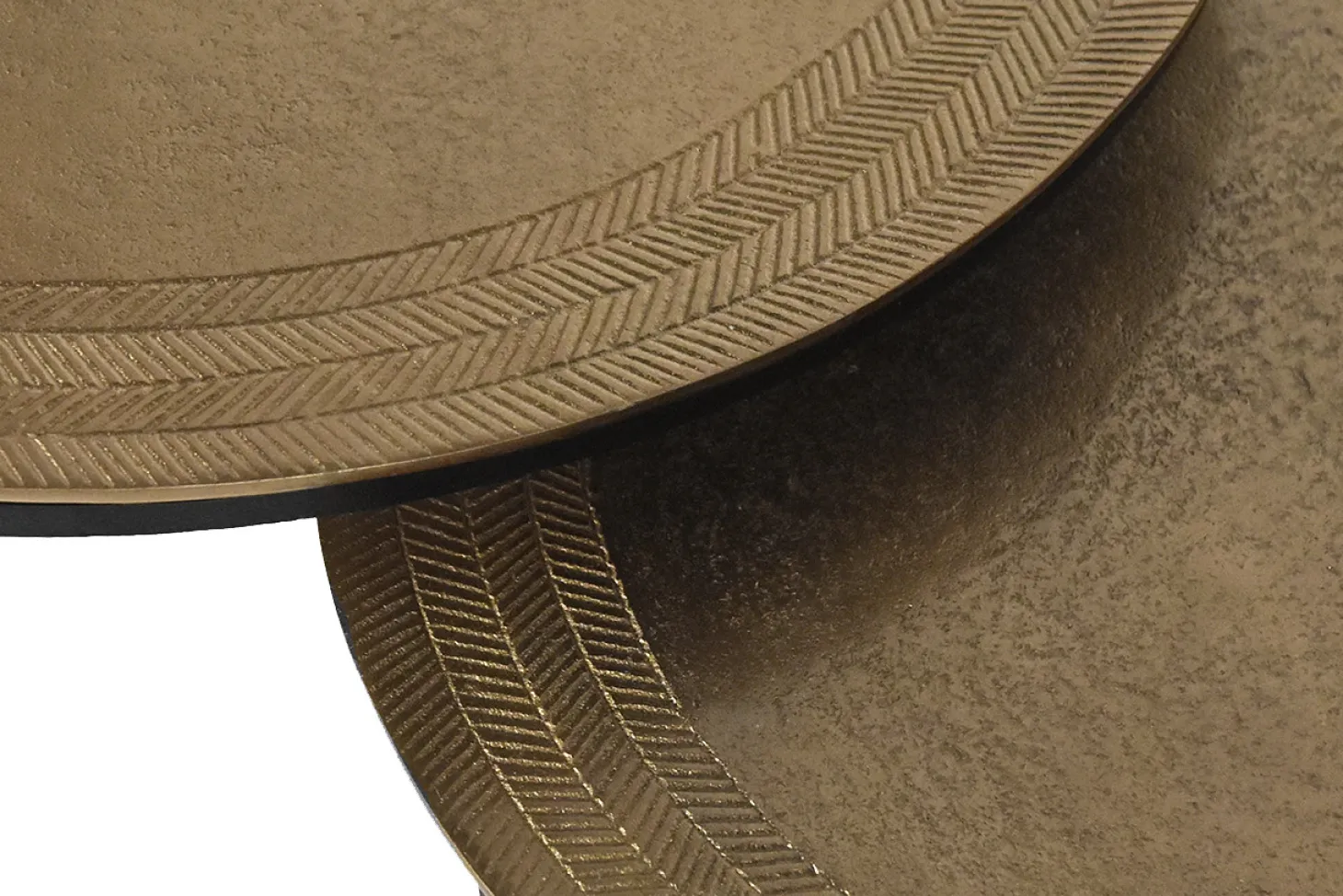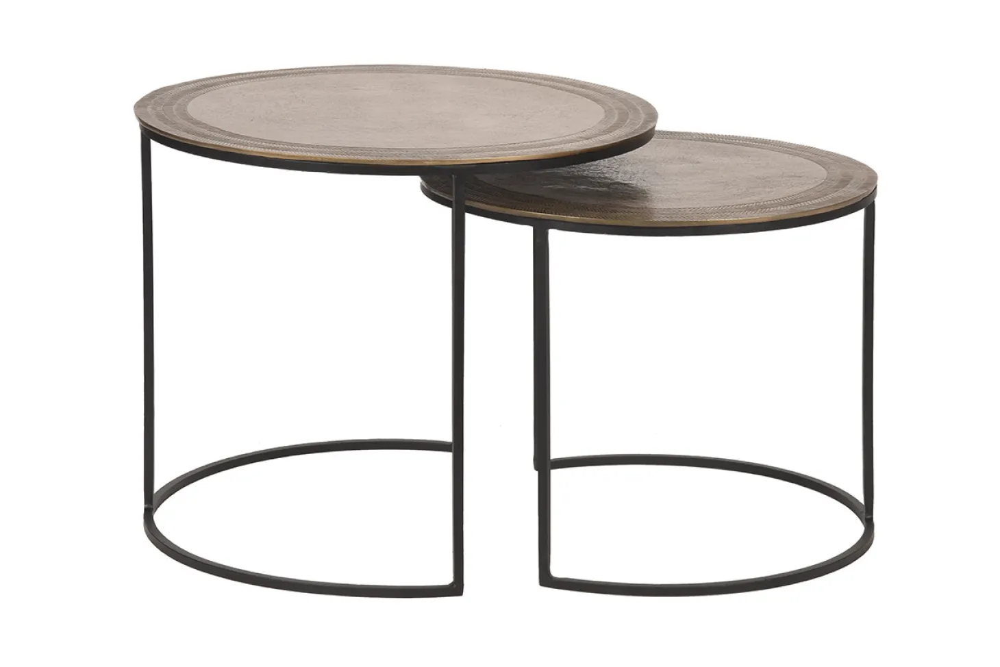 Salontafel Alfa is een set die bestaat uit twee ronde salontafels met ieder een eigen afmeting (55x55x45 cm en 50x50x39 cm). De tafelbladen zijn gemaakt van trendy nickel met een gouden afwerking. Leuk detail is het chique patroon op het tafelblad. Samen met het metalen frame krijgt salontafelset Alfa een industrieel karakter, maar door zijn eenvoud past deze set in iedere woonstijl. De twee handzame salontafels kun je wegzetten zoals jij wilt, of onder elkaar schuiven wanneer dit nodig is.