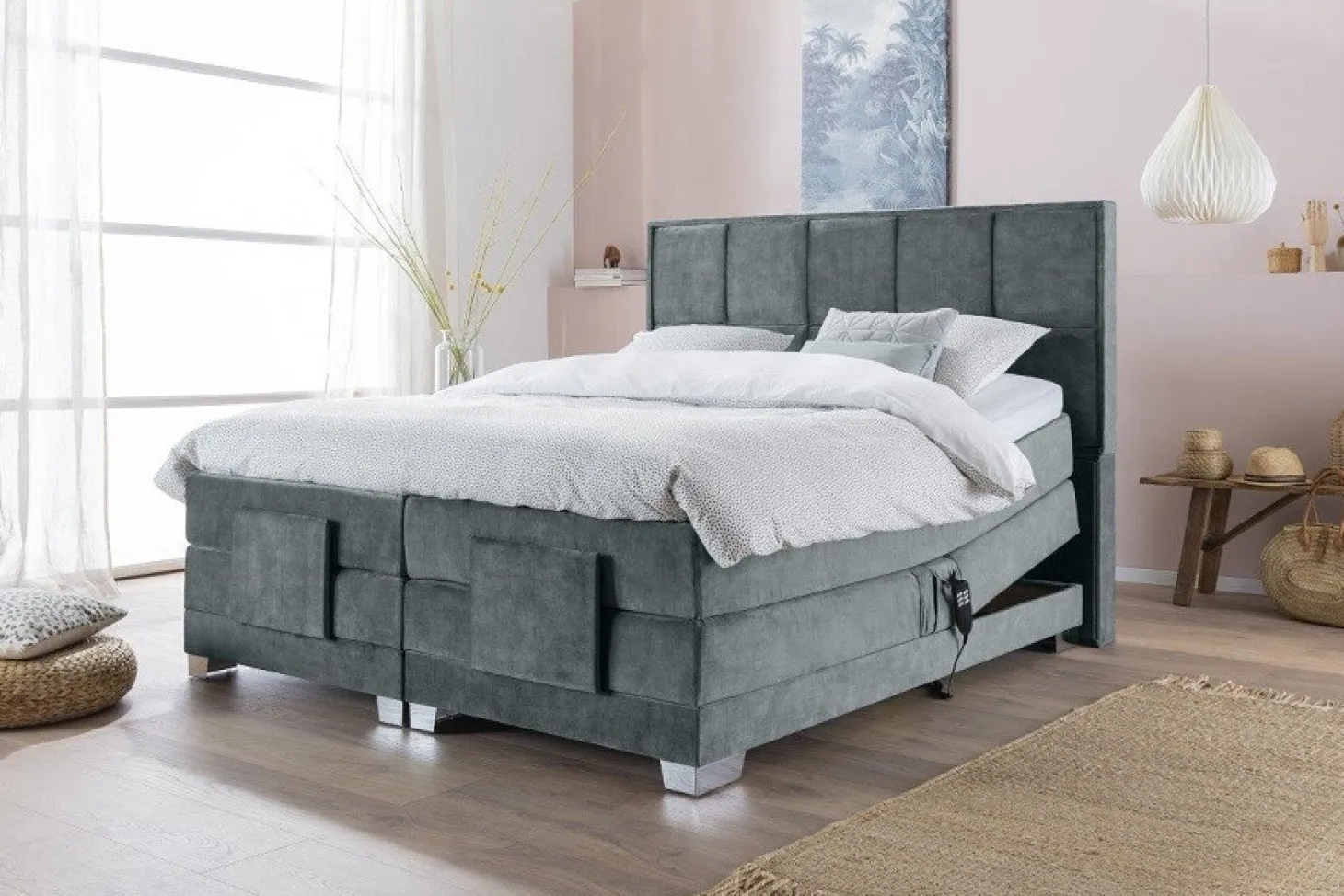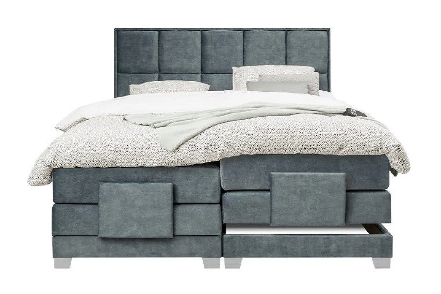 Complete boxspringset • 2-persoons luxe boxspring afgewerkt met zadelstiksel • Luxe boxen met pocketvering – 7 comfortzones • Luxe matrassen met pocketvering – 7 comfortzones en comfortschuim afdeklaag • Inclusief design hoofdbord • Inclusief potenset Corner Chrome Metal • Ook elektrisch mogelijk en met voetbord • Dit model is helemaal compleet & meegestoffeerd.