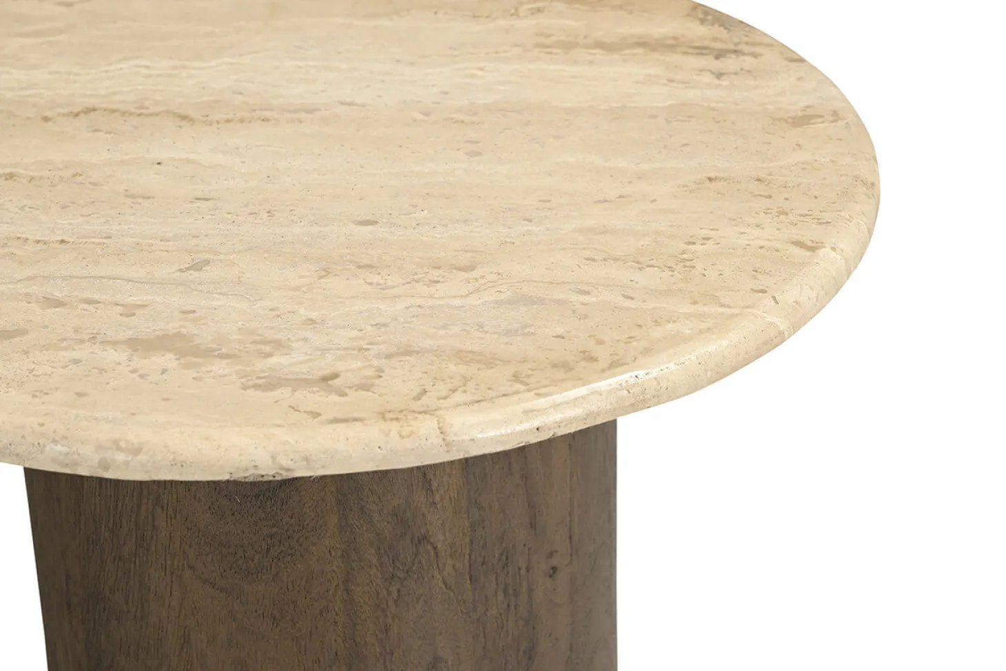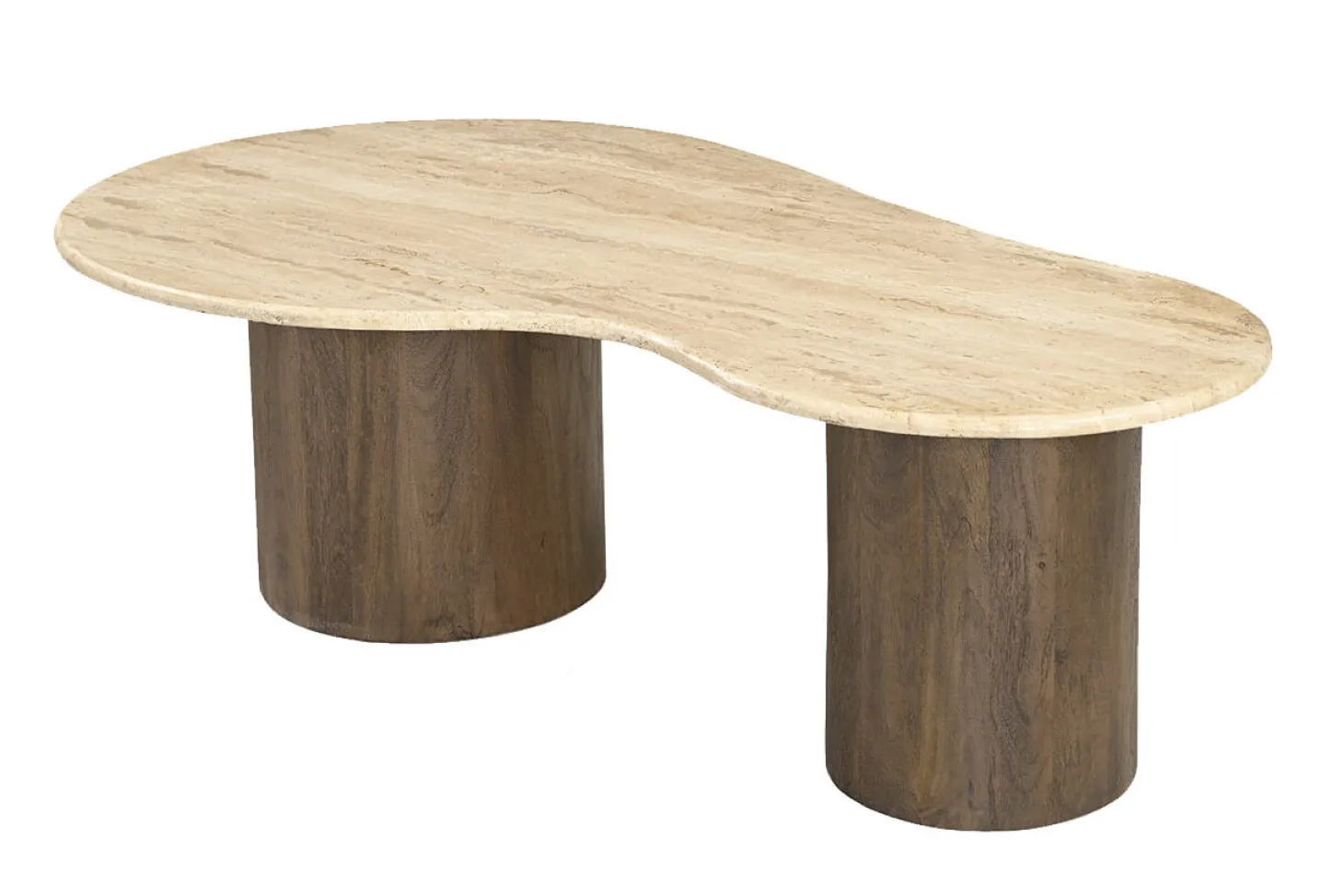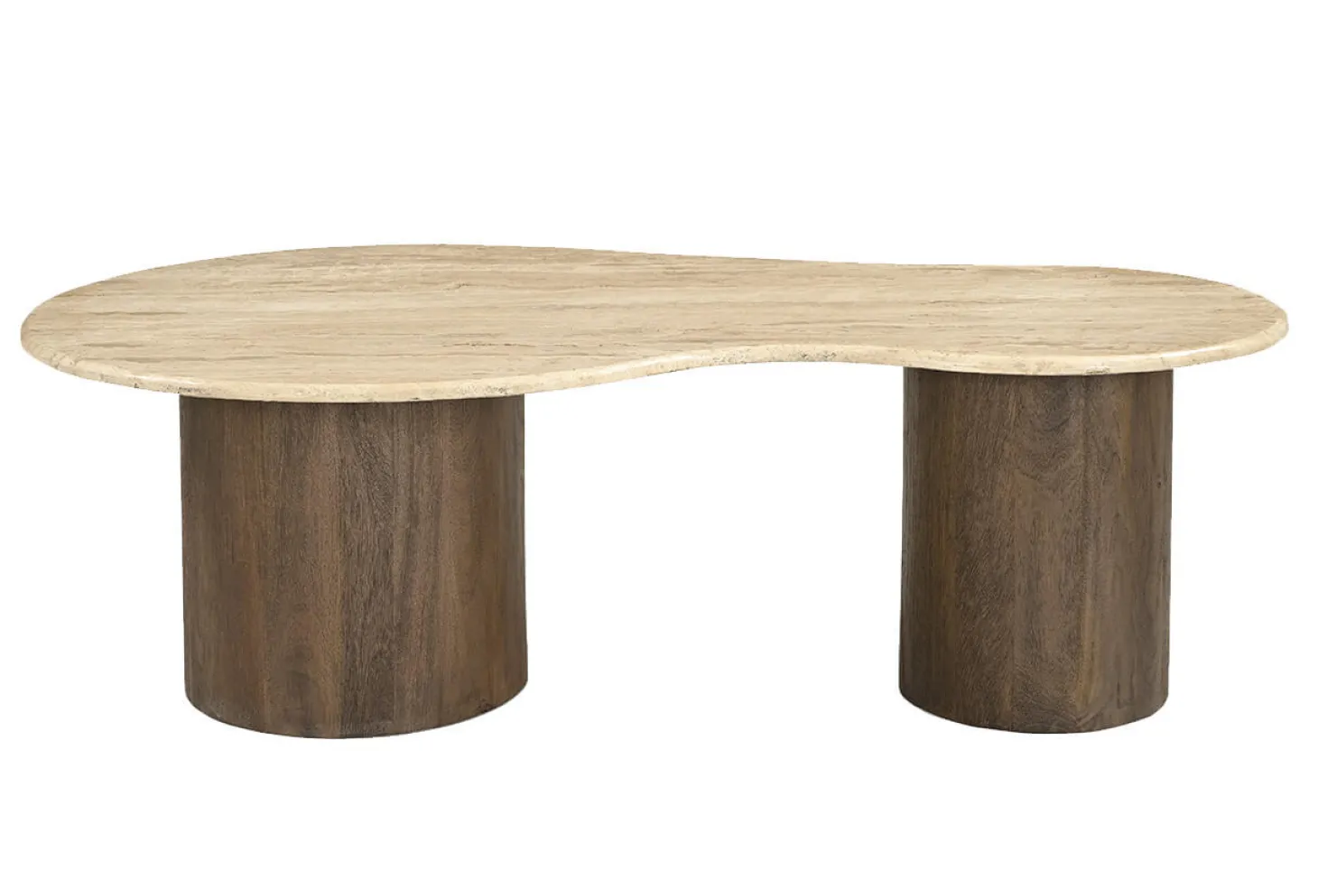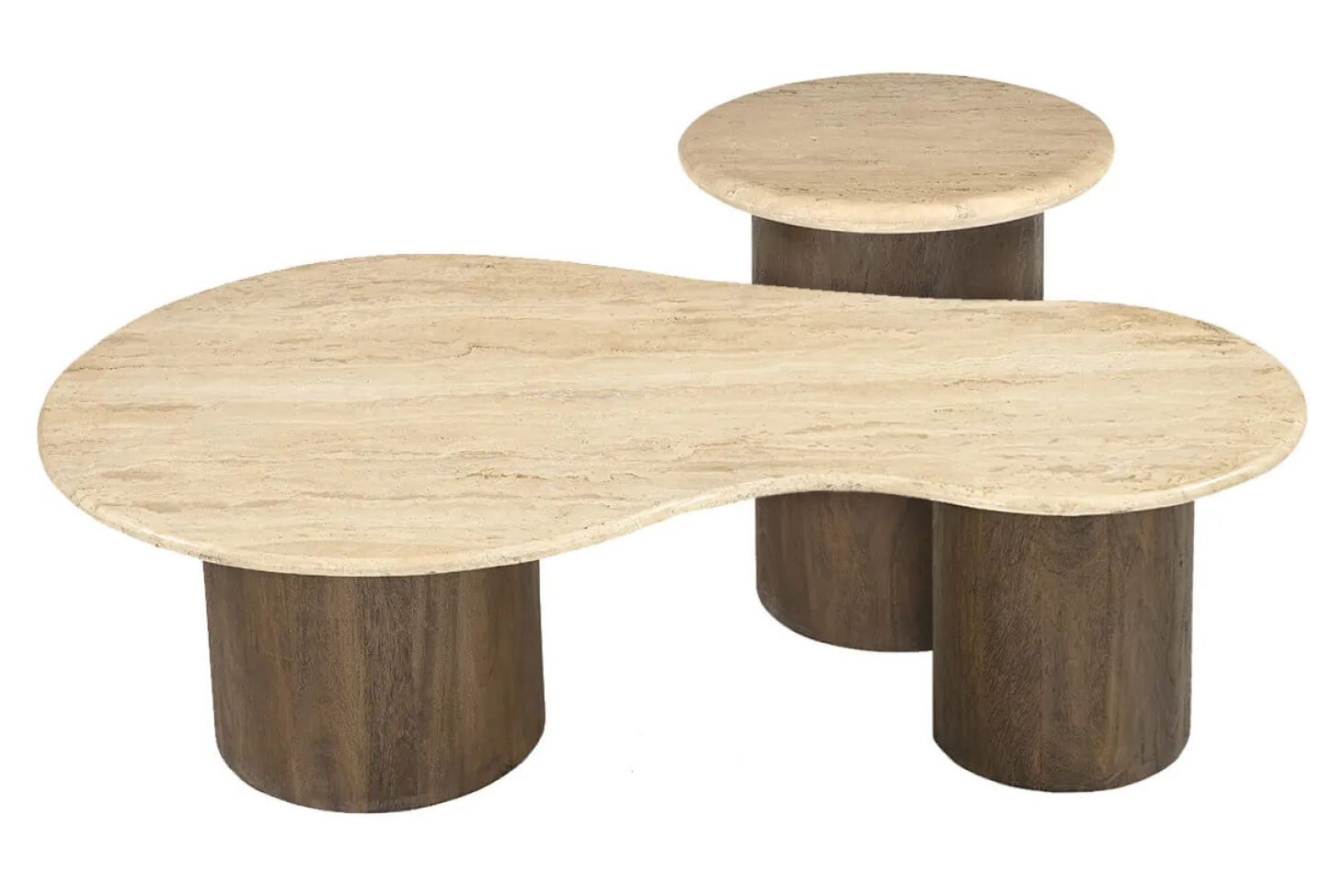 Set van 2 organisch gevormde salontafels met luxe travertin bovenblad en onderstel van mango hout. Hoogwaardige kwaliteit en luxe design.