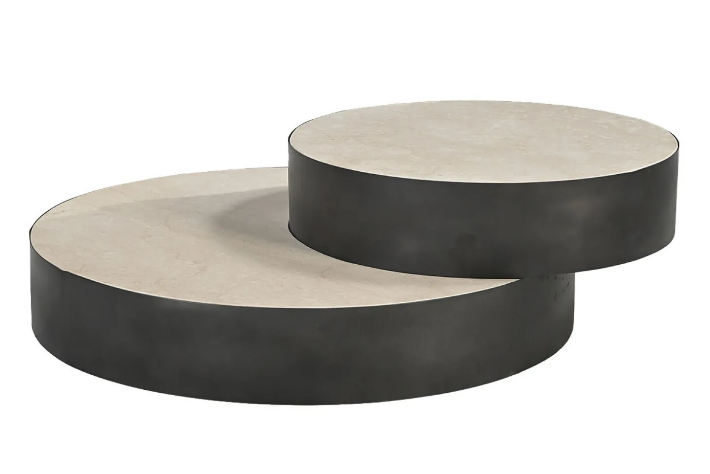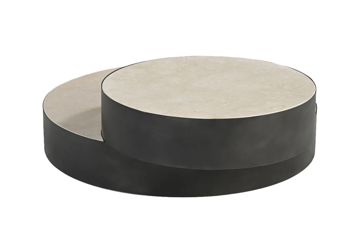 Stijlvolle ronde salontafel met marmeren bottocino bovenblad en metalen onderstel. Uniek ontwerp van hoogwaardige kwaliteit.