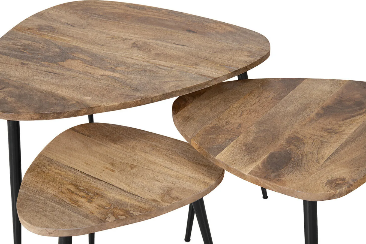 Grenoble is een set van 3 minimalistische salontafels met mango houten blad en zwart metalen pootjes.