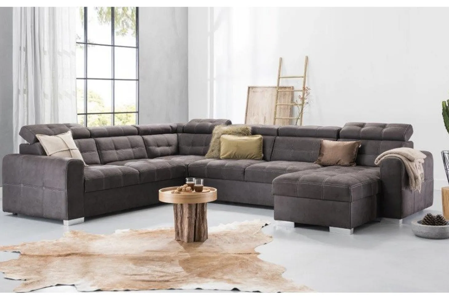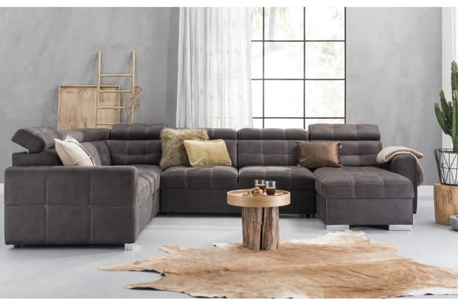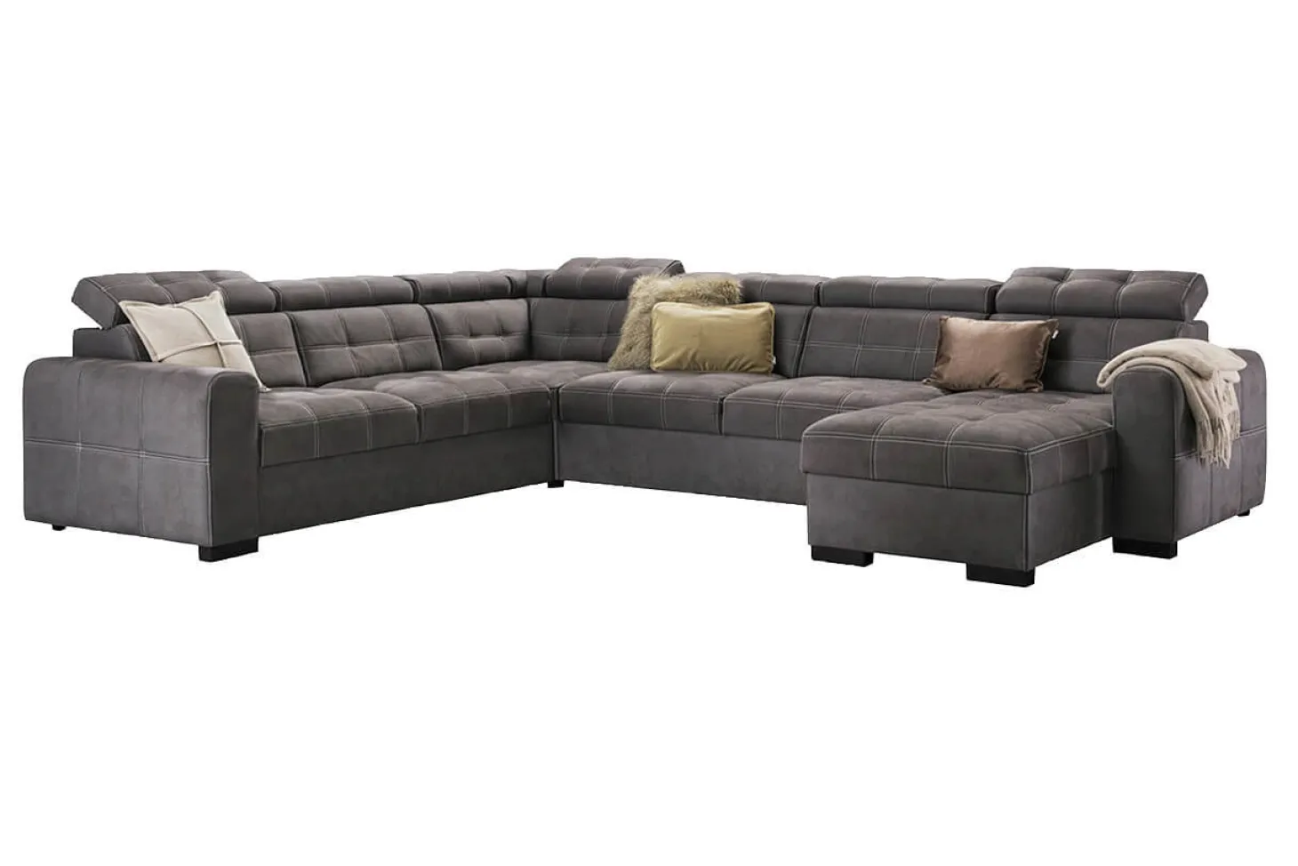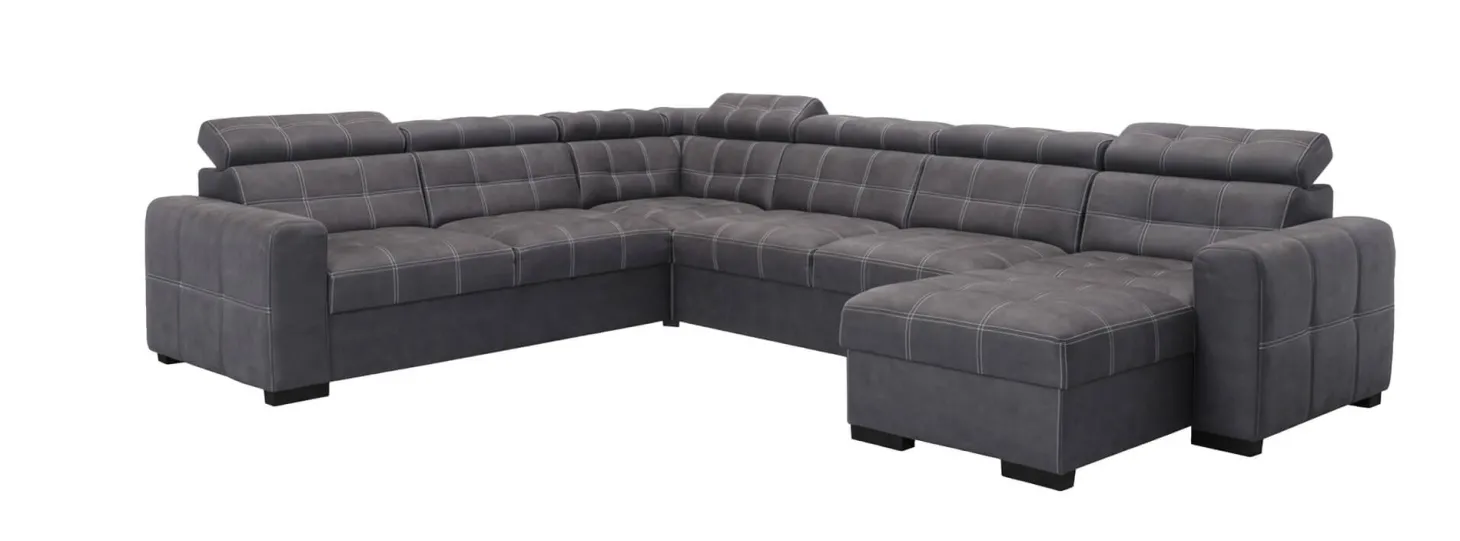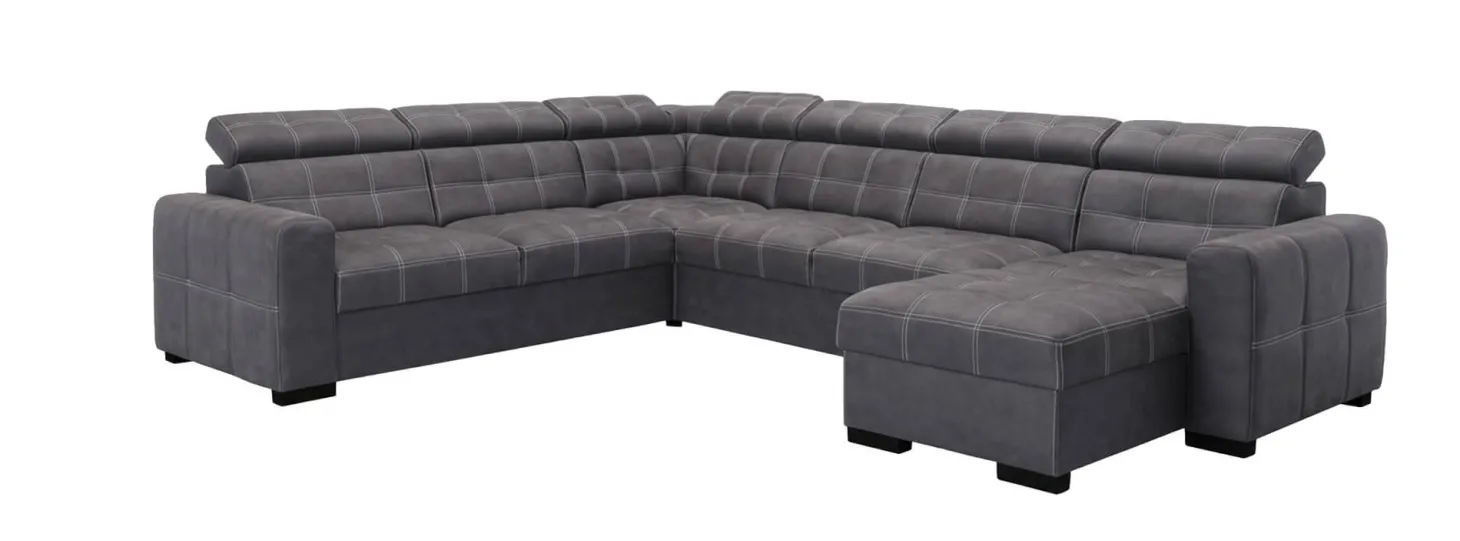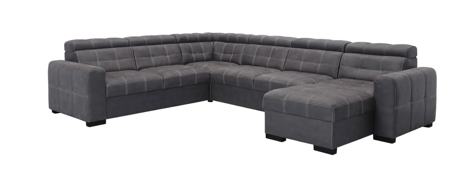 Robuuste hoekbank met modieuze dubbele stiksels en met verstelbare hoofdsteunen. Ook als 3-2-1 zits leverbaar en in diverse andere (hoek)opstellingen. Als 3+Hoek+3+Longchair in stofcat. 1 Supreme.