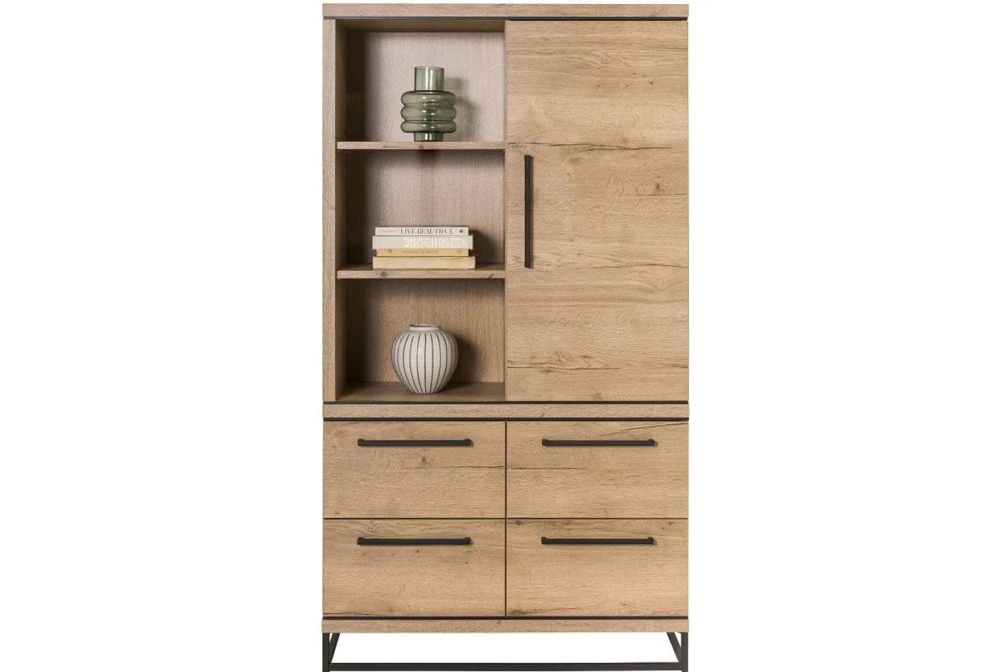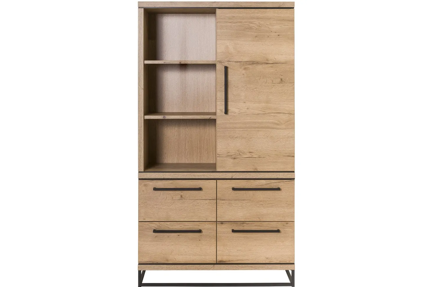 Wandkast Lissabon heeft een moderne uitstraling en is uitgewerkt in kleurstelling industrial nature. Dit meubel wordt gekenmerkt door het natuurlijke hout en de zwarte elementen. De poten die in sledevorm onder de kast staan zorgen voor de strakke, industriële look. Hierdoor is deze wandkast erg gewild bij mensen die houden van een modern, landelijk of industrieel interieur. Net als dit meubel zijn er uit deze woonserie diverse items leverbaar.