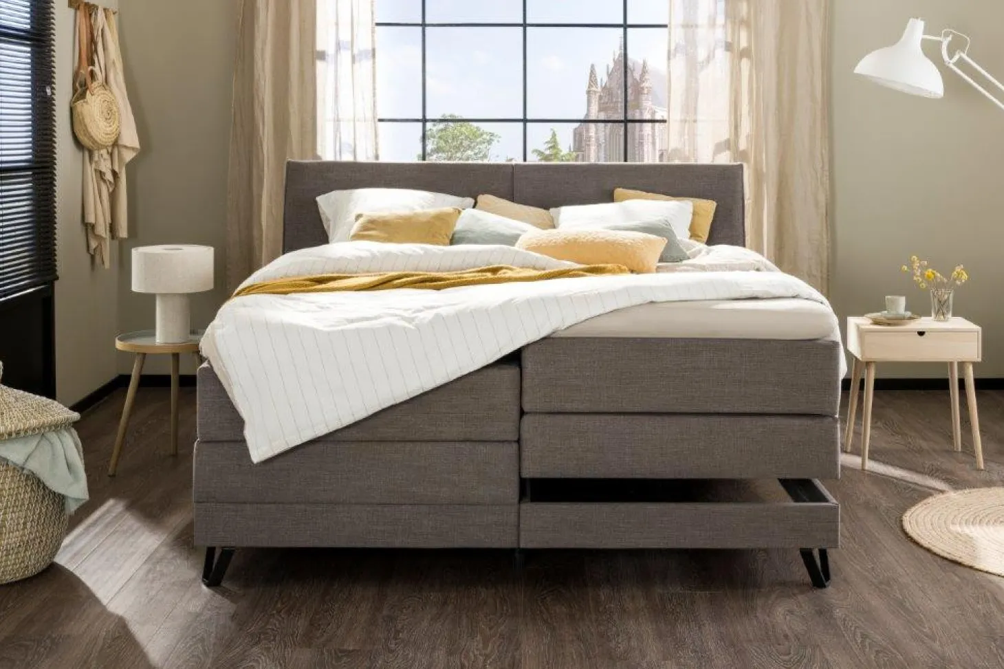 Een hotel chique slaapkamer is niet compleet zonder model Majestic. Deze luxe 2-persoons boxspring past met zijn klassieke uitstraling gemakkelijk in een slaapkamer met modern of landelijk interieur. Model Majestic is helemaal compleet & meegstoffeerd. Door de ruime keuze in bekleding en kleur is dit model geheel naar wens samen te stellen waardoor je het hotelgevoel gemakkelijk in huis kunt halen. Daarnaast kent dit model luxe extra’s; zo is een elektrisch verstelbare uitvoering mogelijk en behoort een ledverlichting-set aan het hoofdbord tot één van de opties.