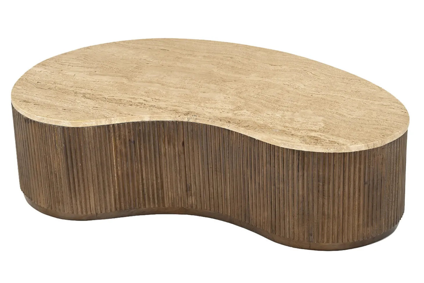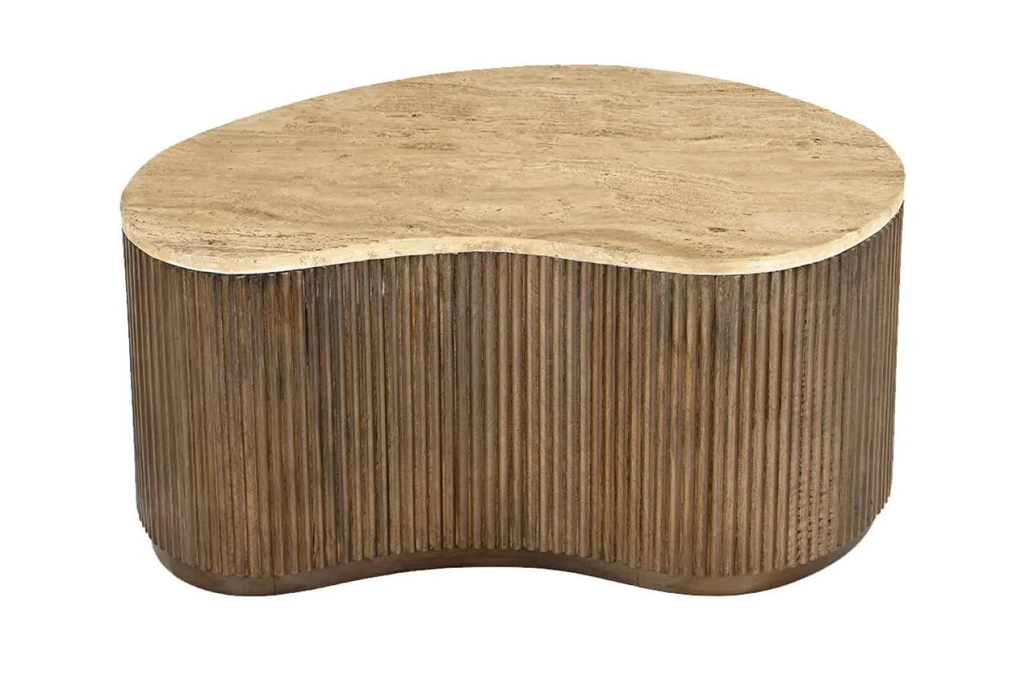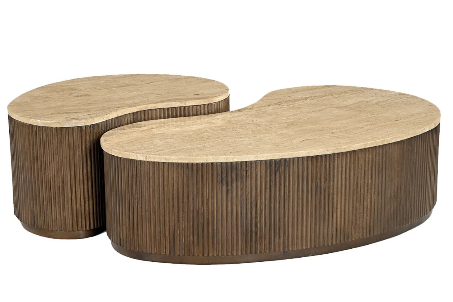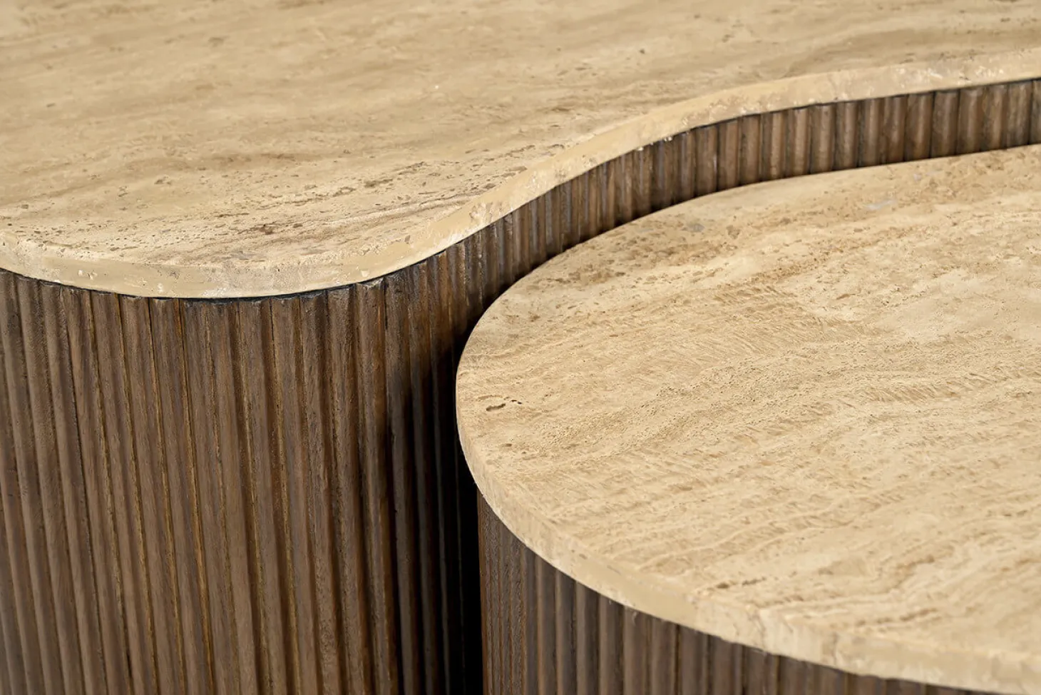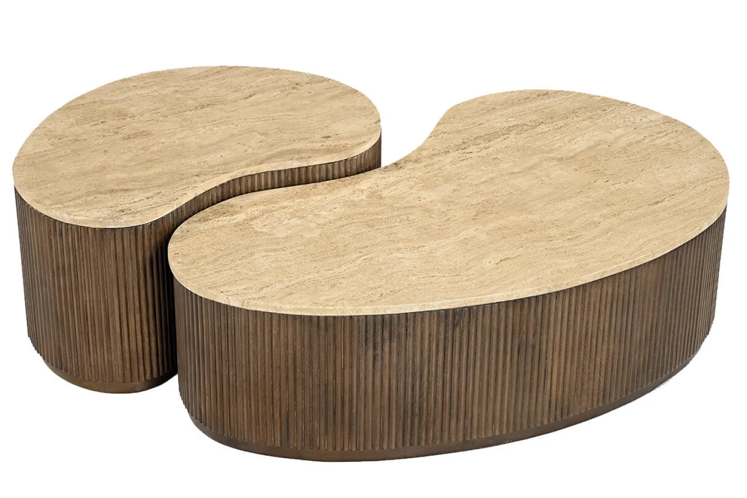 Set van 2 organisch gevormde salontafels met luxe travertin bovenblad en onderstel van donker mango hout. Hoogwaardige kwaliteit en luxe design.