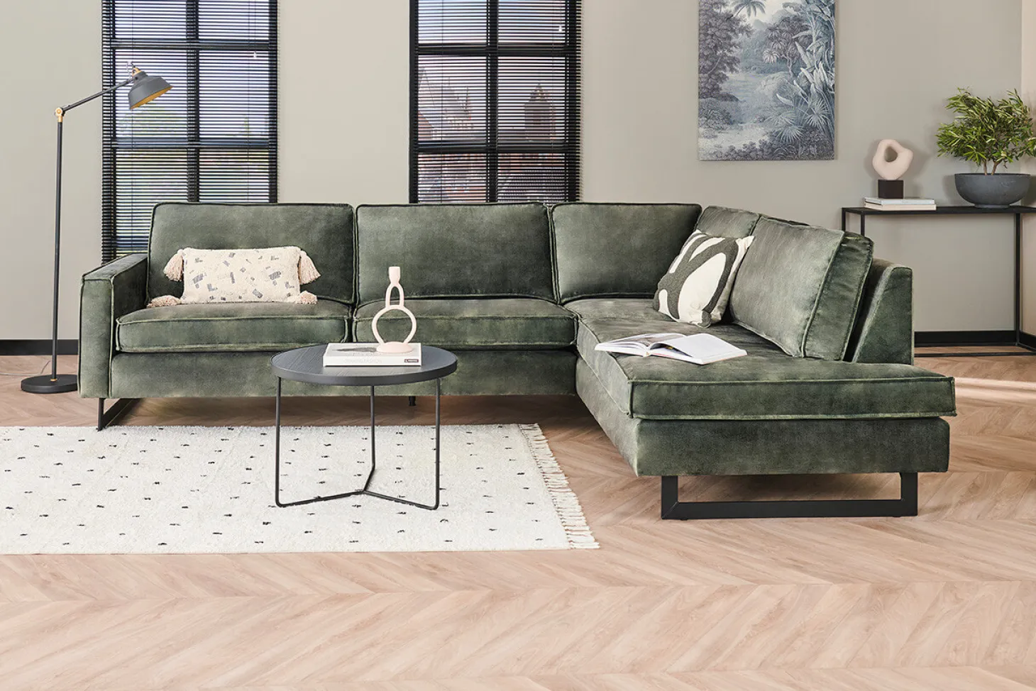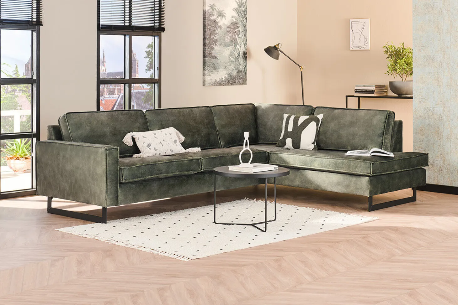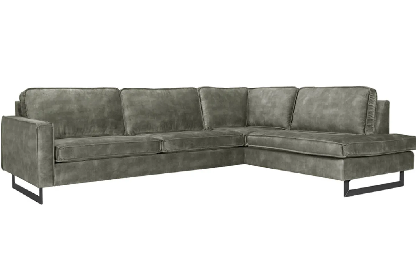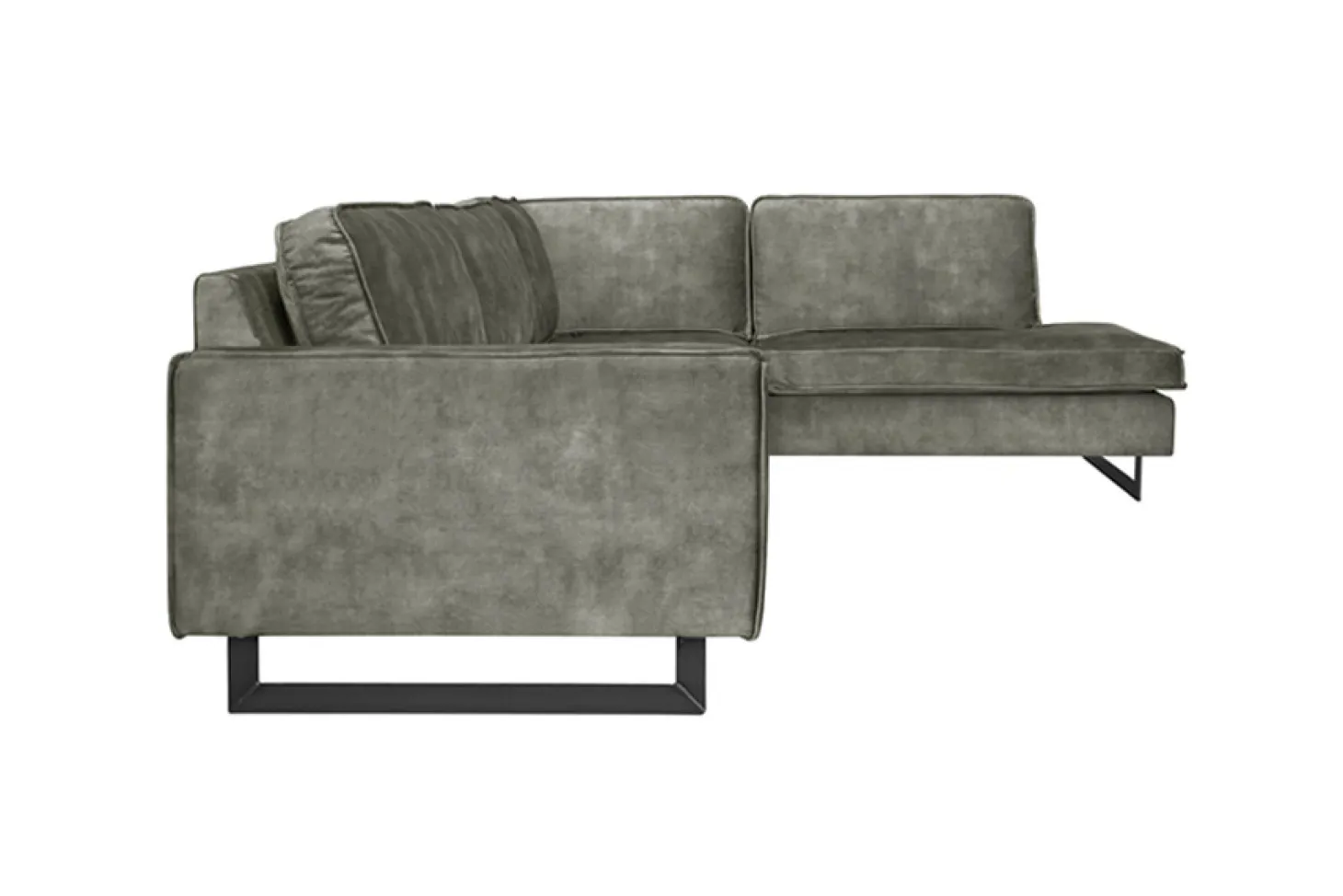 Industriële hoekbank met sledepoot en stoer stiksel. Opstelling kan ook gespiegeld. Diverse kleuren, bekledingen en opstellingen mogelijk. Aanbieding in stof Supreme.