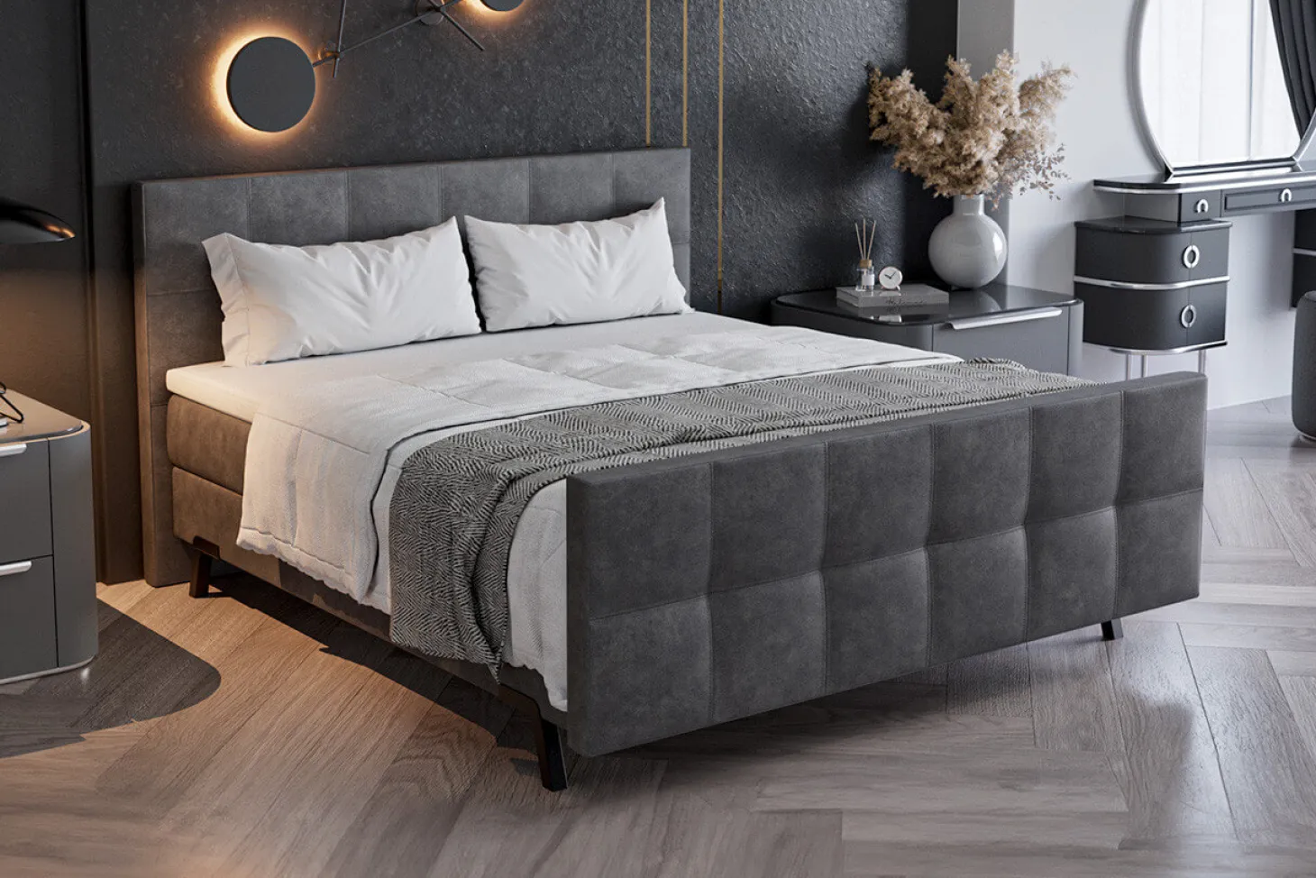 Met boxspring Mirage creëer je een hotel chique slaapkamer waarin je helemaal tot rust kunt komen. Het hoofd- en voetbord zijn voorzien van een subtiel geblokt stiksel waarbij de bekleding licht gecapitonneerd is. Een 2-persoons boxspringset met een luxe uitstraling, die in iedere type slaapkamer past en geheel naar wens is samen te stellen. Boxspring Mirage is in diverse kleuren en maten leverbaar. Ook als elektrische uitvoering mogelijk, of met een ledverlichting-set als extra optie aan het hoofdbord.