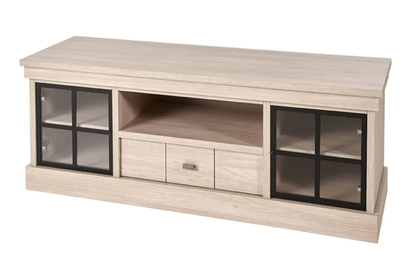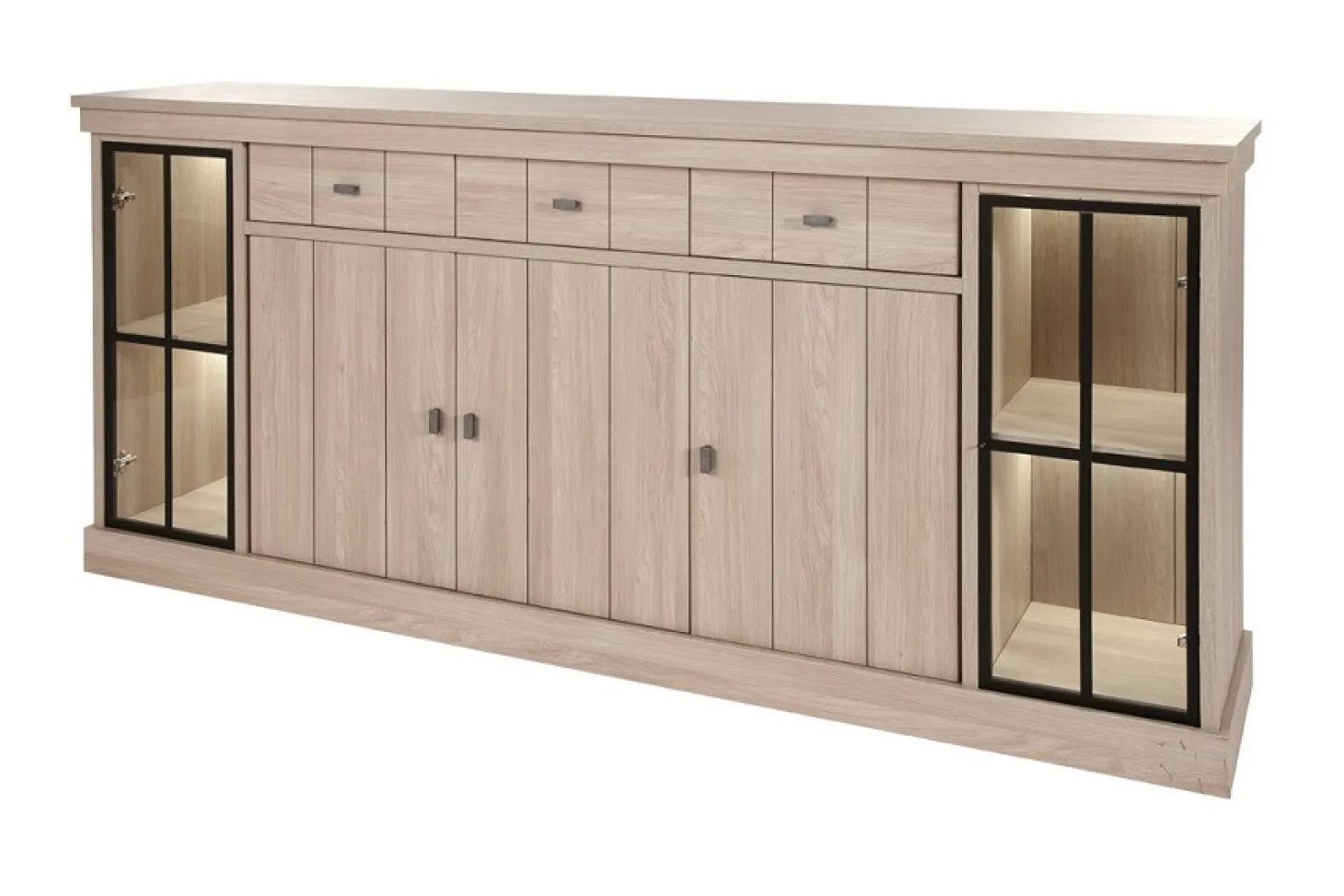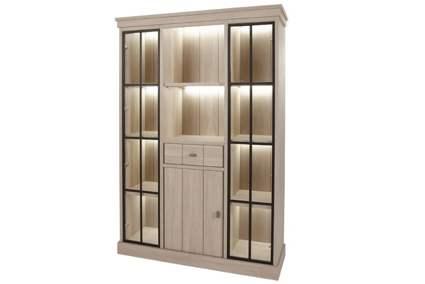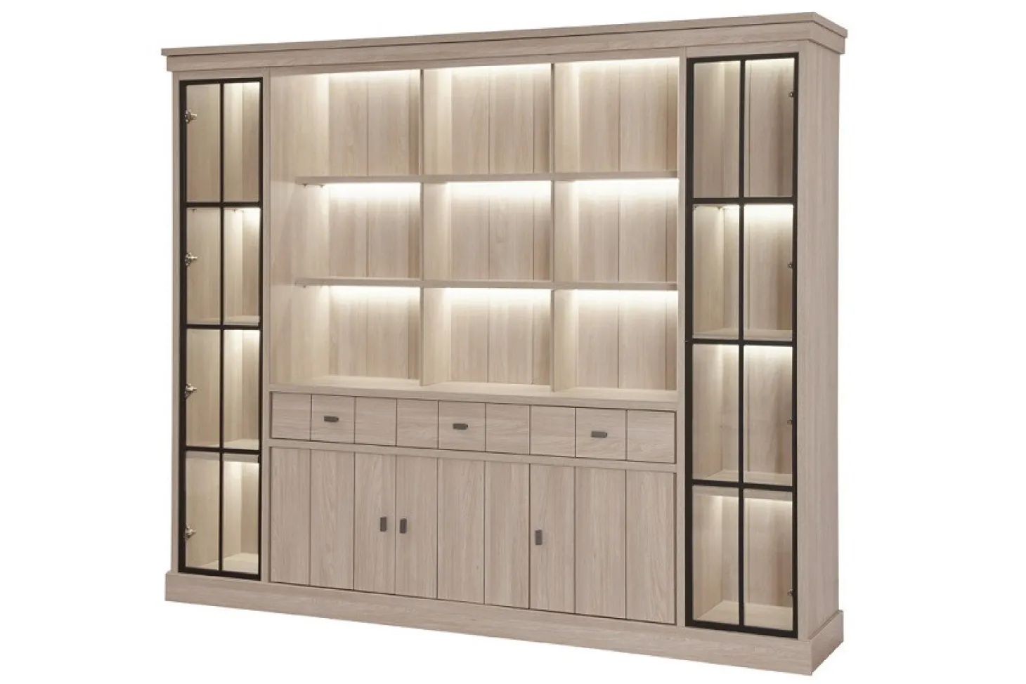 Het woonprogramma Murano in kleurstelling natuurlijk olm met mooie zwarte details in de meubels. Door de energiezuinige ledverlichting geeft het een bijzondere en gezellige uitstraling.