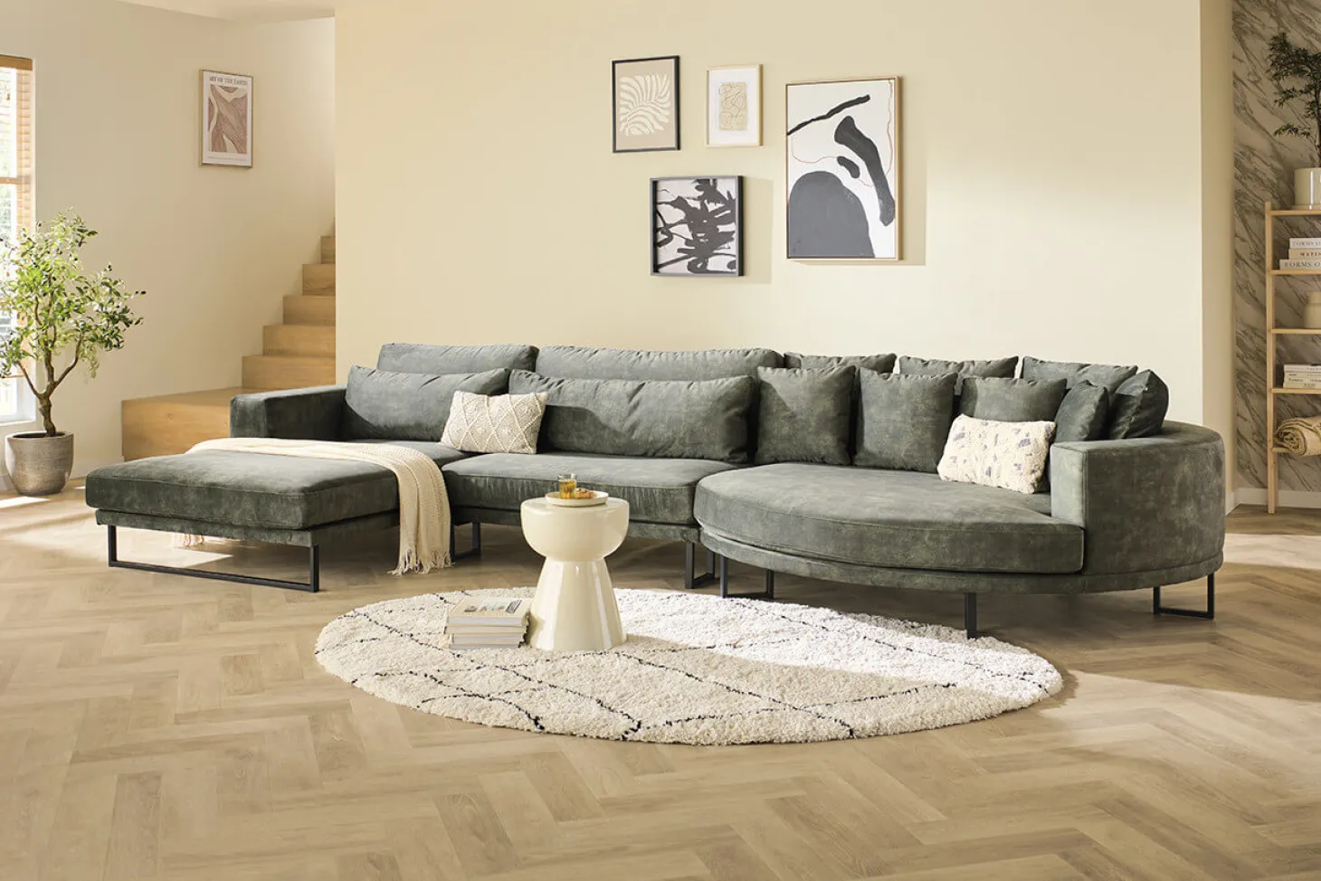 Moderne loungebank met slanke pootjes en rond eiland. Mooi design, strak afgewerkt. Prijs als Longchair groot+1½ XL+Eiland rond in stof cat. 1 Supreme.