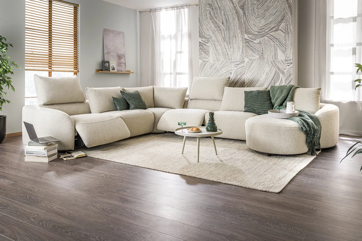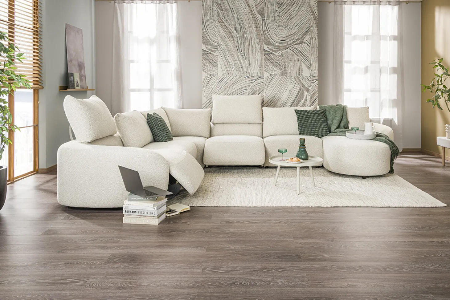 Model San Dior is een robuuste hoekbank met zeer hoog zitcomfort en organische vormen. Leverbaar met optionele elektrische relaxsystemen. Als 2XL-Hoek-2XL in stof cat. 1 Supreme.