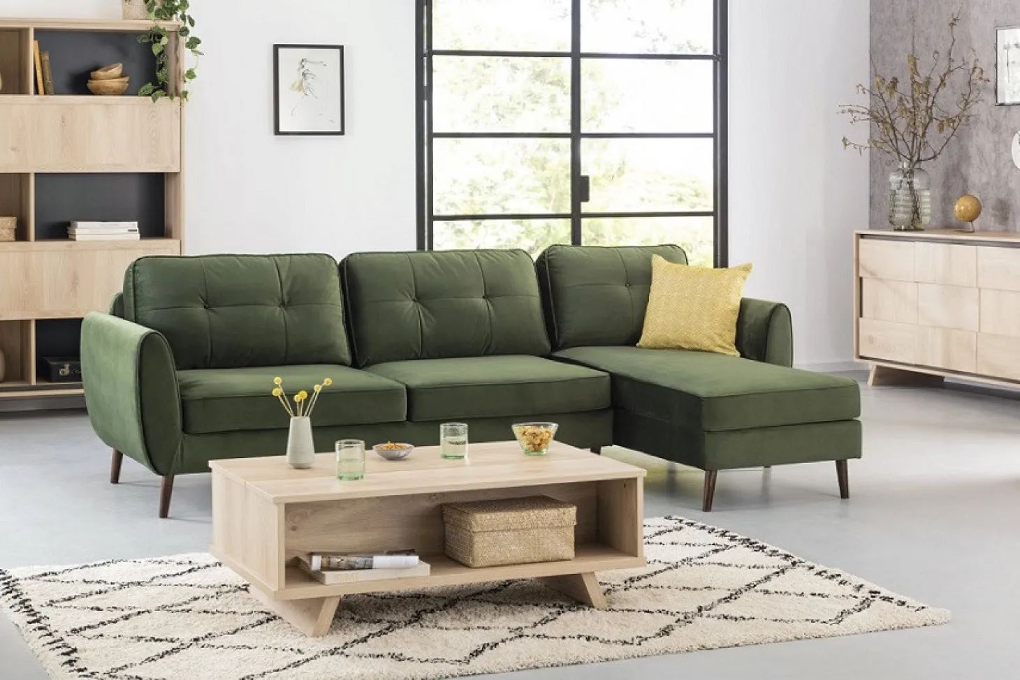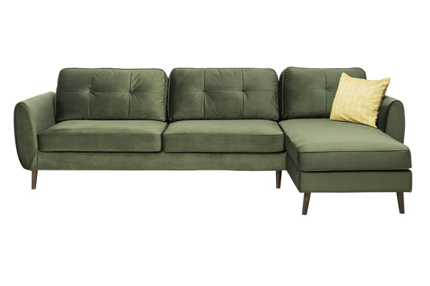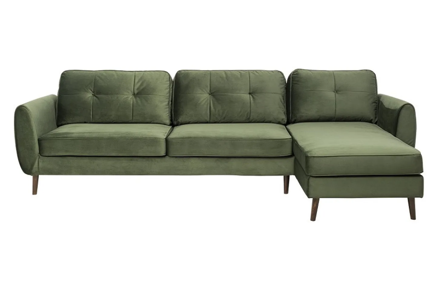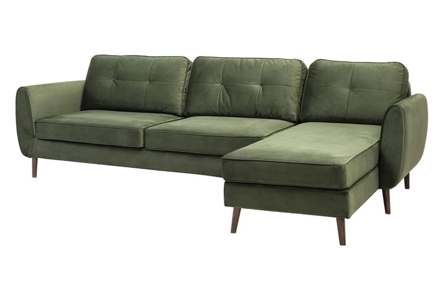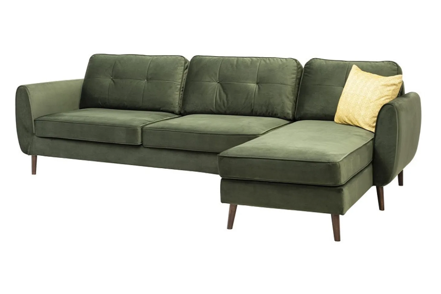 Trendy hoekbank met longchair. Een slank en retro design, onder meer door de stiksels op de rugkussens en de smalle poten.