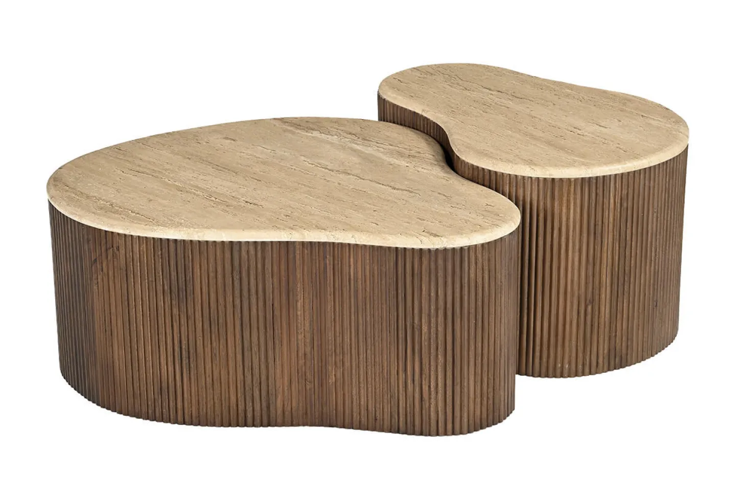 Set van 3 organisch gevormde salontafels met luxe travertin bovenblad en onderstel van mango hout. Hoogwaardige kwaliteit en luxe design.