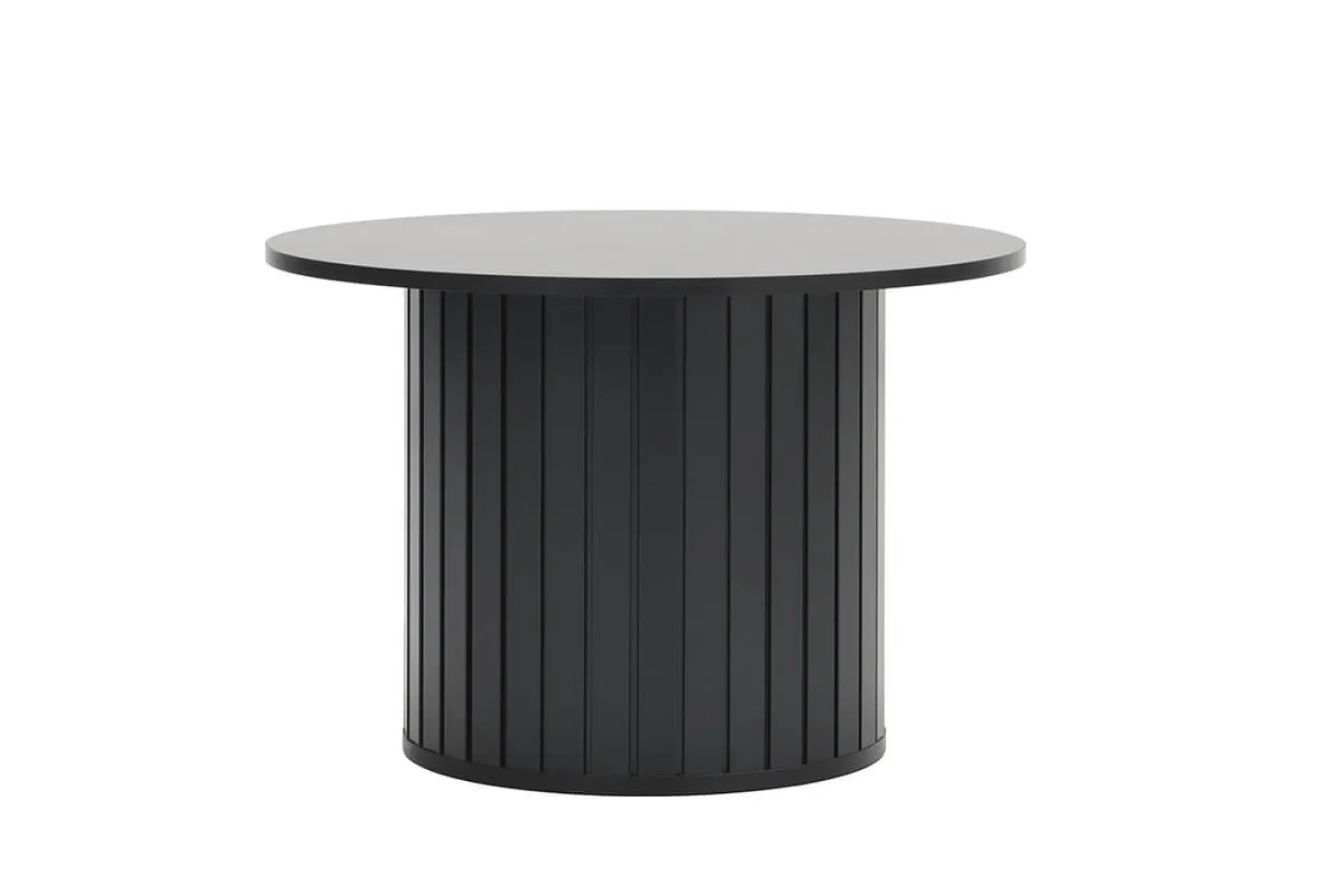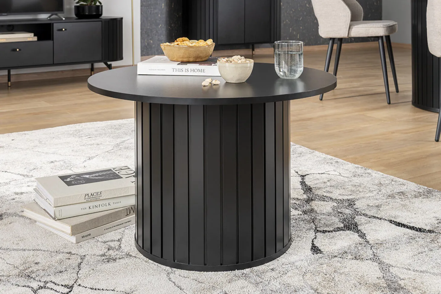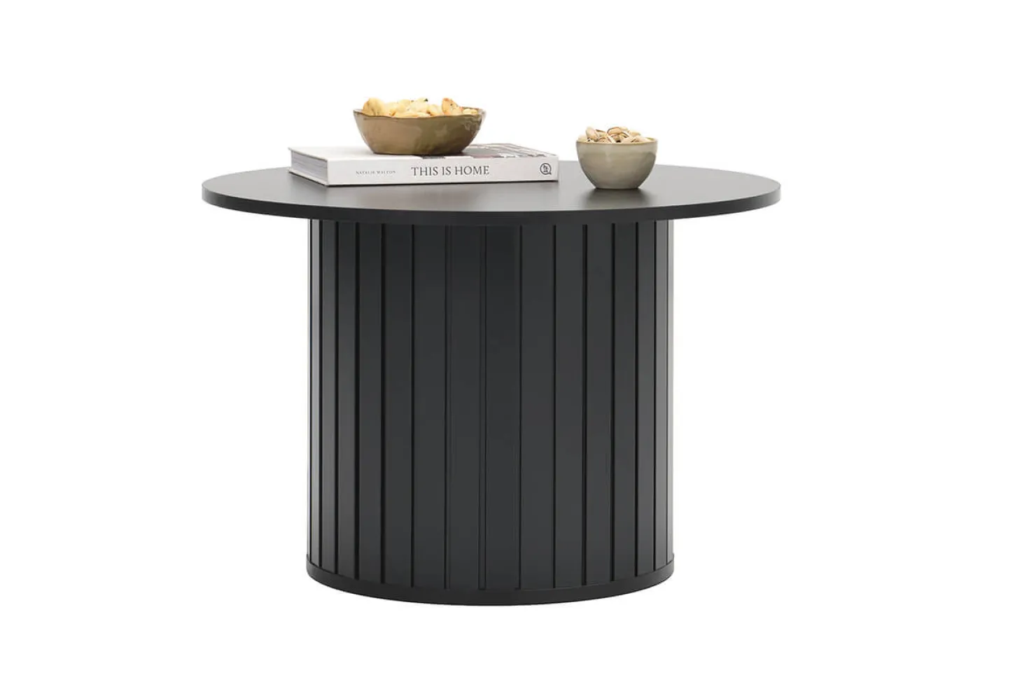 Trendy zwarte salontafel met rond blad en rond onderstel. Geheel in Japandi stijl.