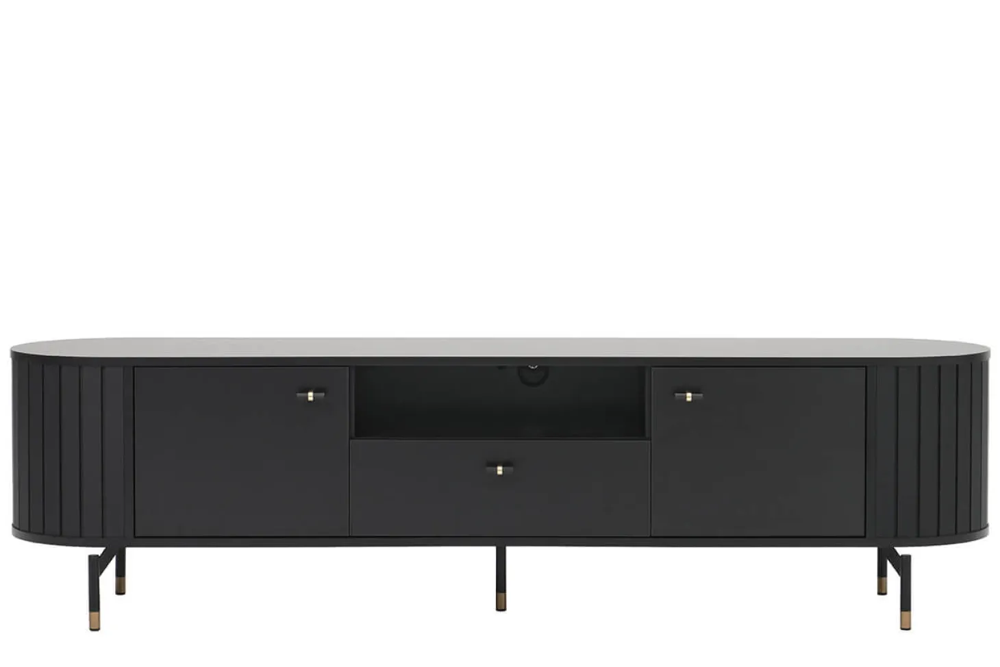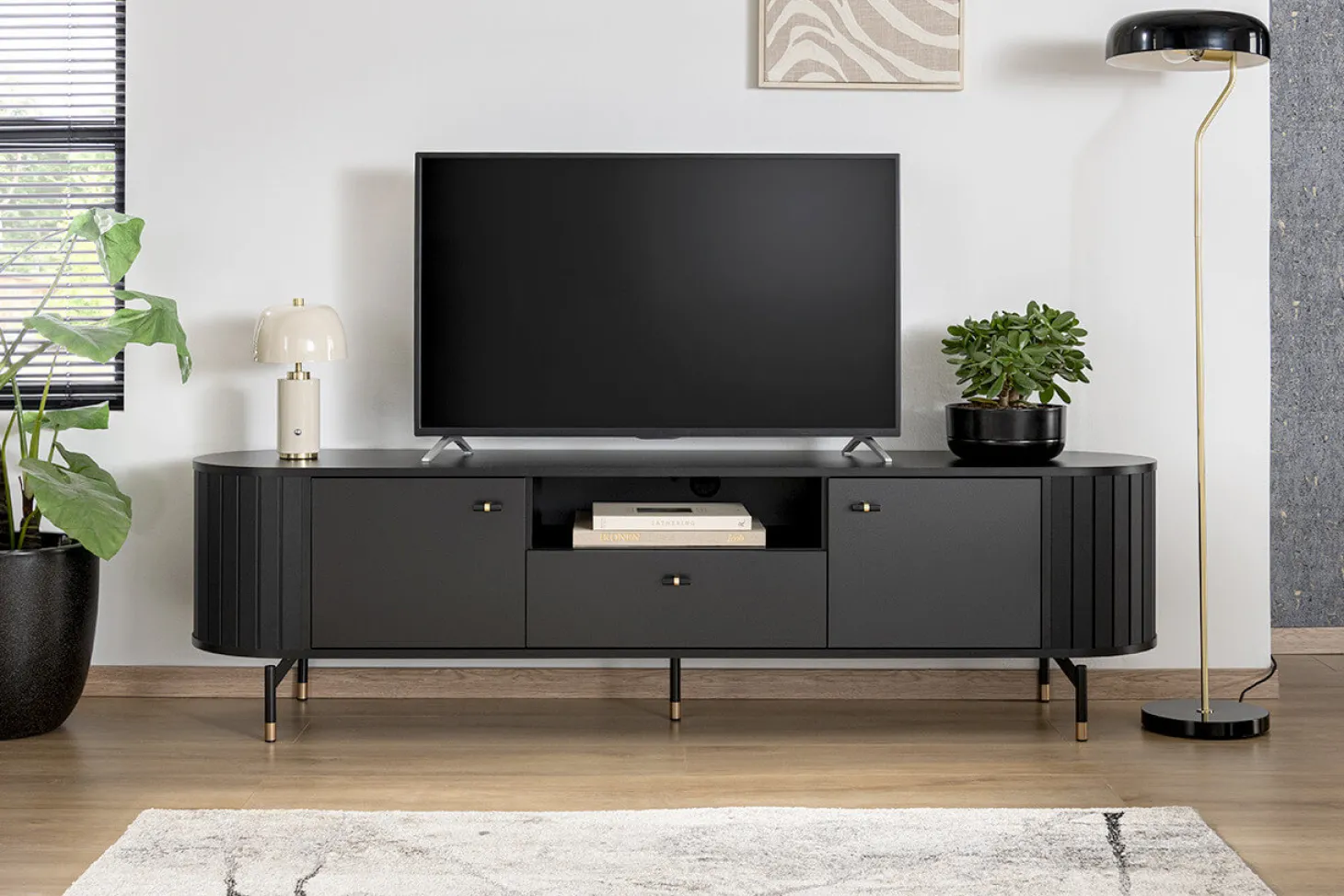 Trendy zwart TV-meubel met afgeronde hoeken en subtiele gouden details. Geheel in Japandi stijl.