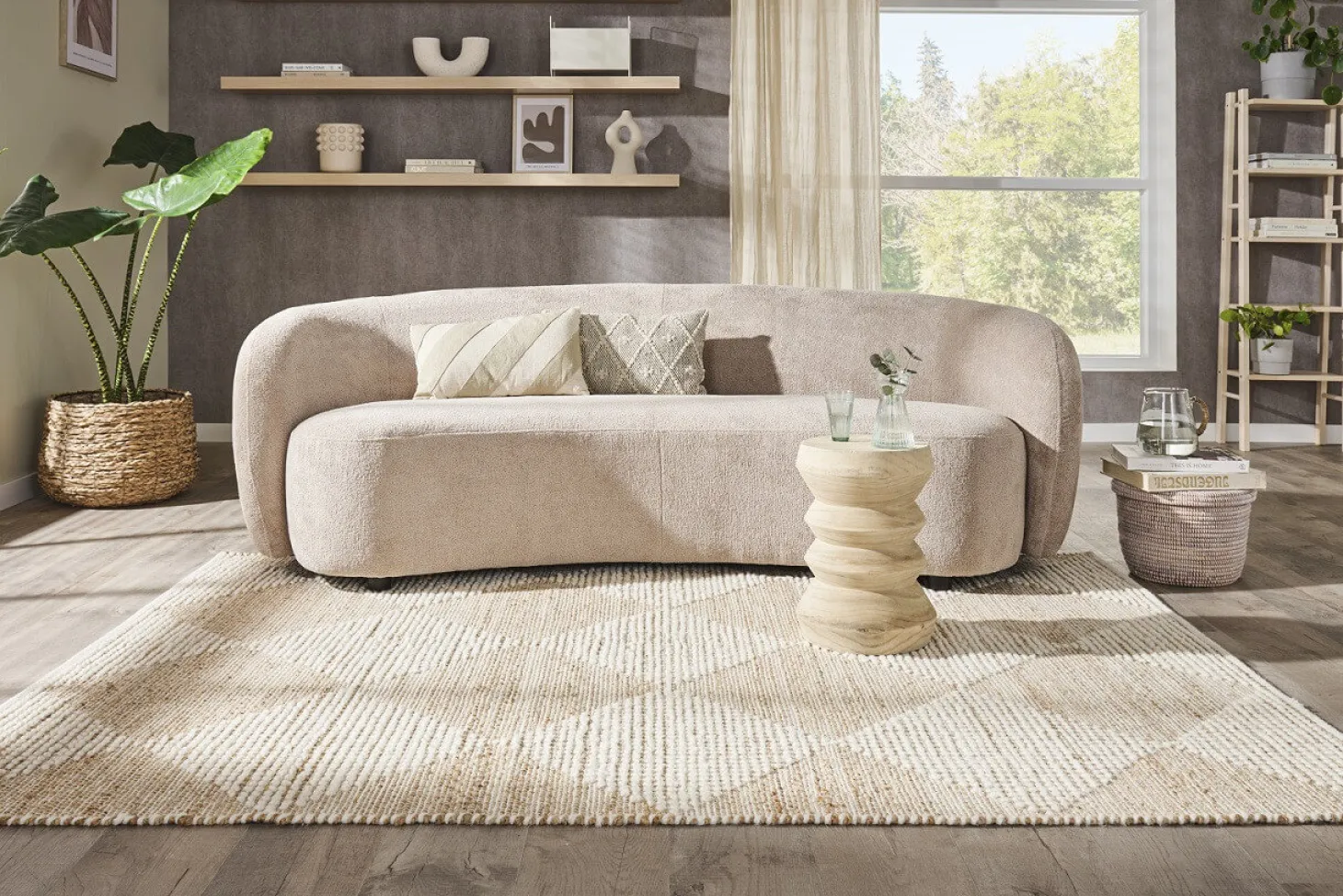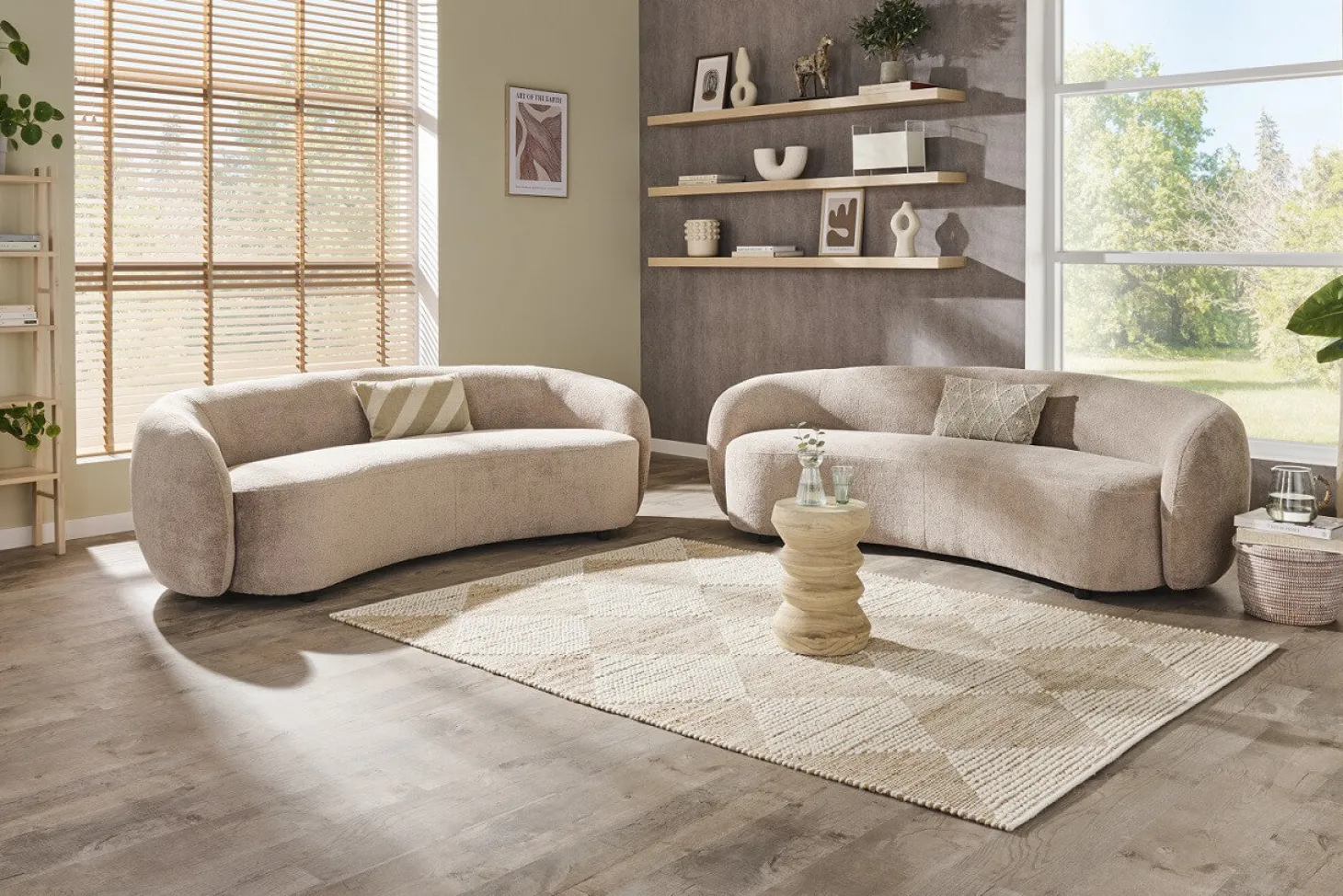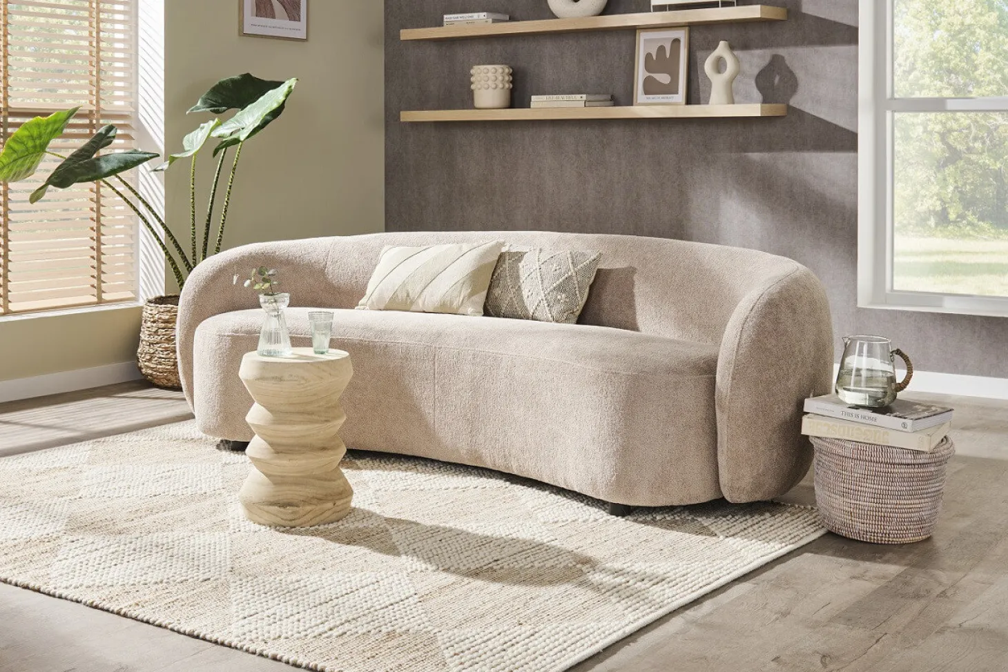 Trendy bank met rond organisch design. Prijs voor afgebeelde bouclé-stof.