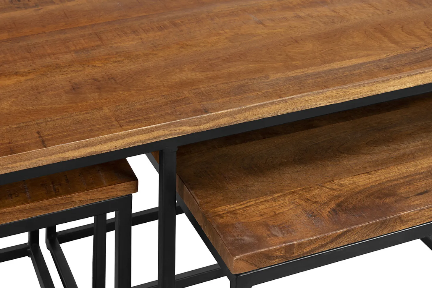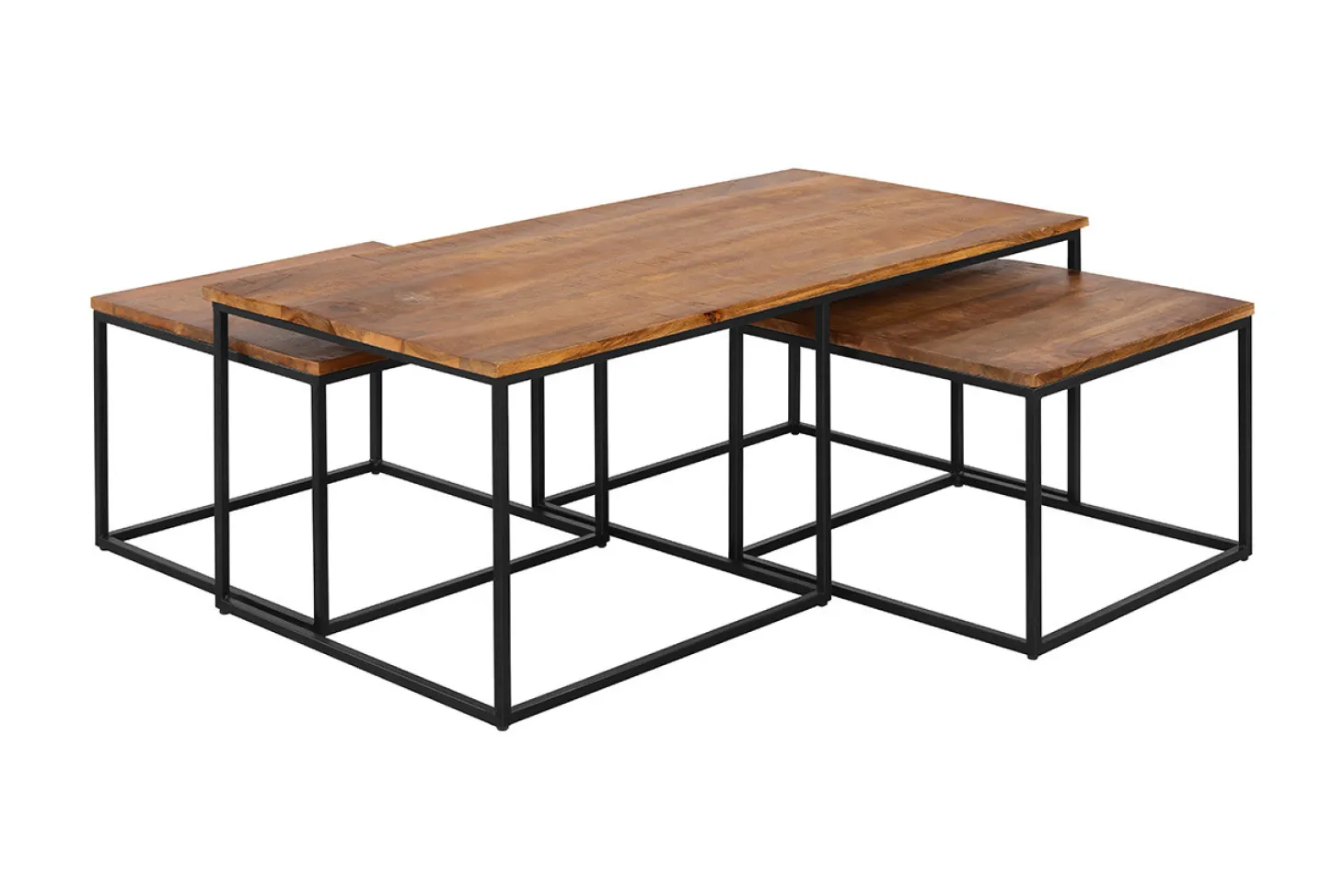 Becker is een set van 3 industriële salontafels met warm mango-houten blad en metalen onderstel.