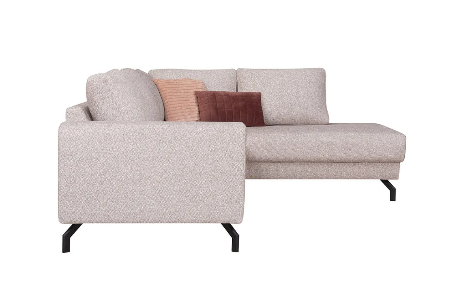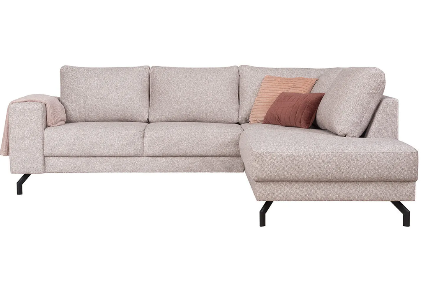 Moderne hoekbank met metalen pootjes. Mooi design, strak afgewerkt. Leverbaar in diverse bekledingen en kleuren. Prijs als Terminal-1+Hoek+2 zits in stof Cat. 1.