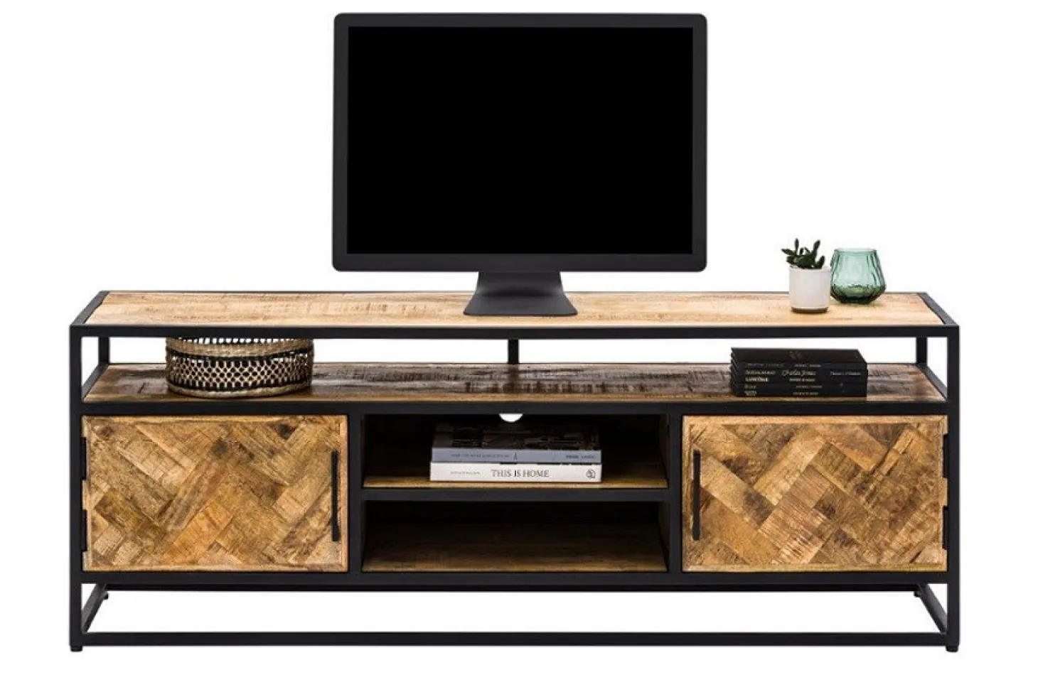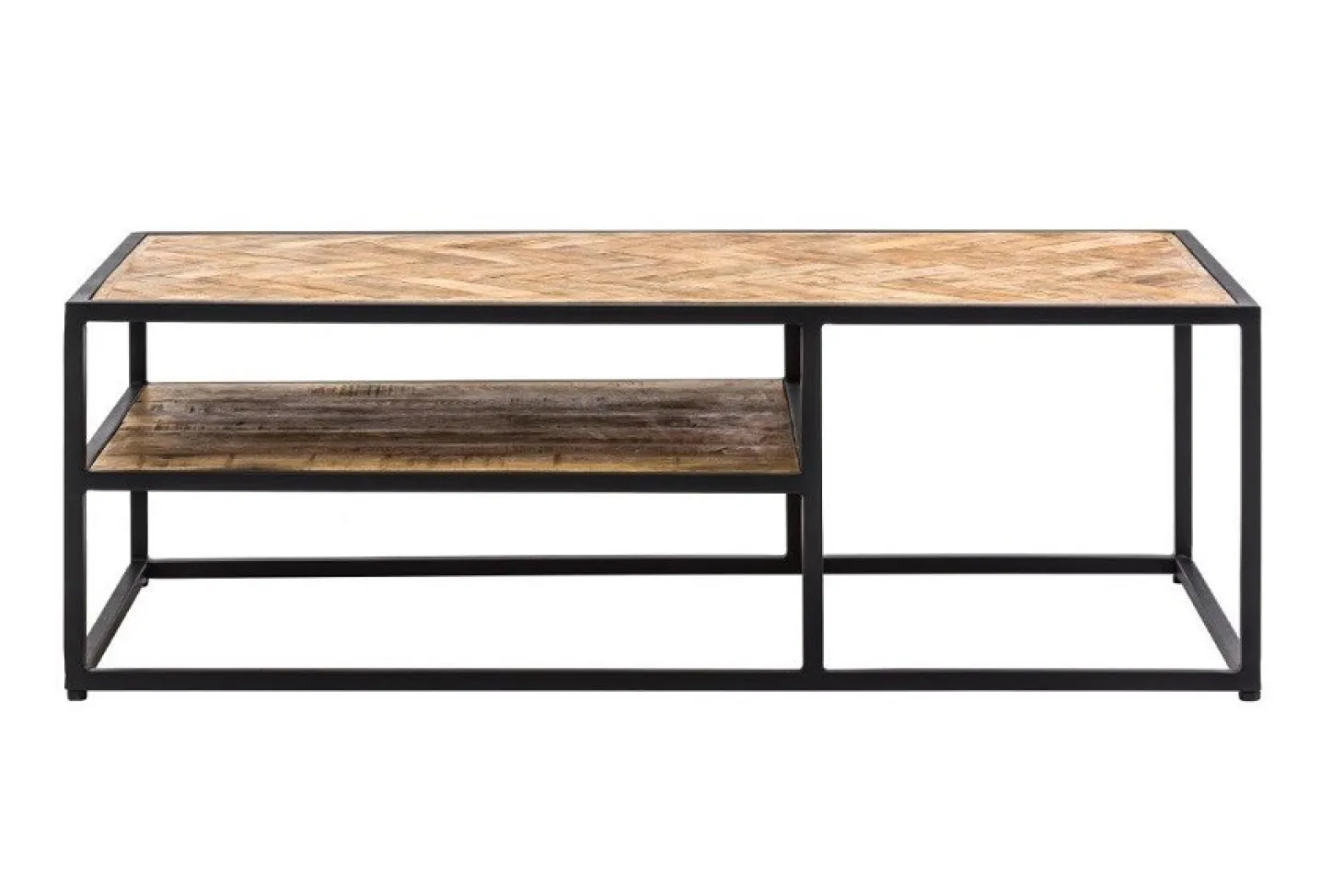 Woonprogramma Carese heeft een stoere maar warme industriële uitstraling door de toepassing van mango-visgraat met strakke zwarte accenten.