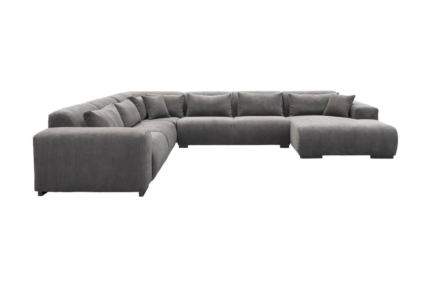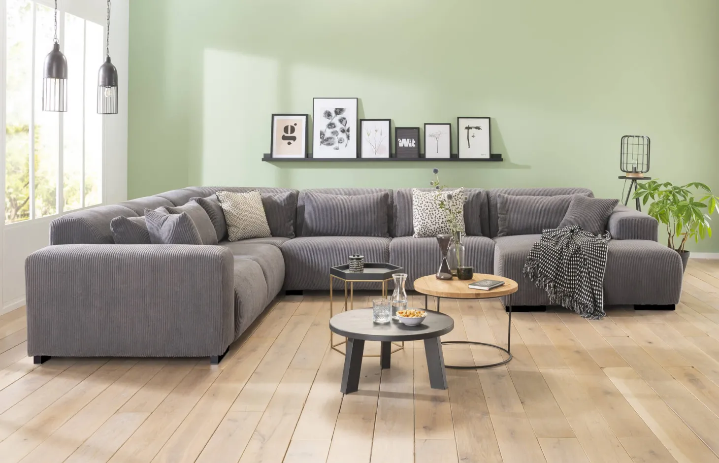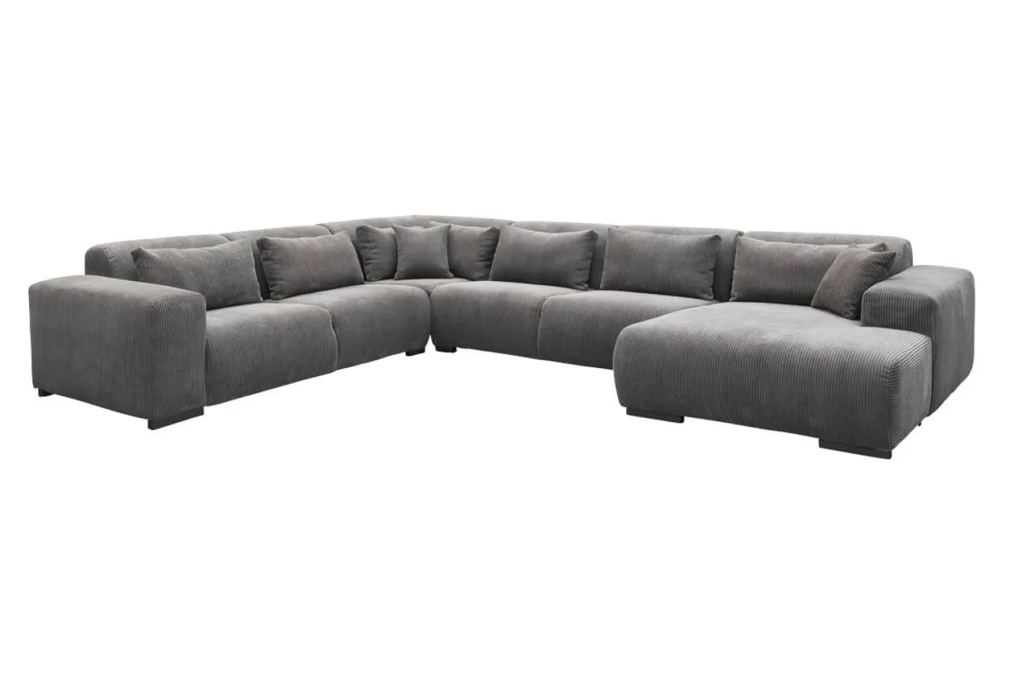 Ruime hoekcombinatie voor heerlijk loungen als 2½+Hoek+2½+Longchair in stofcategorie 1. Ook leverbaar in afgebeelde ribstof en vele andere bekledingen, kleuren en opstellingen.