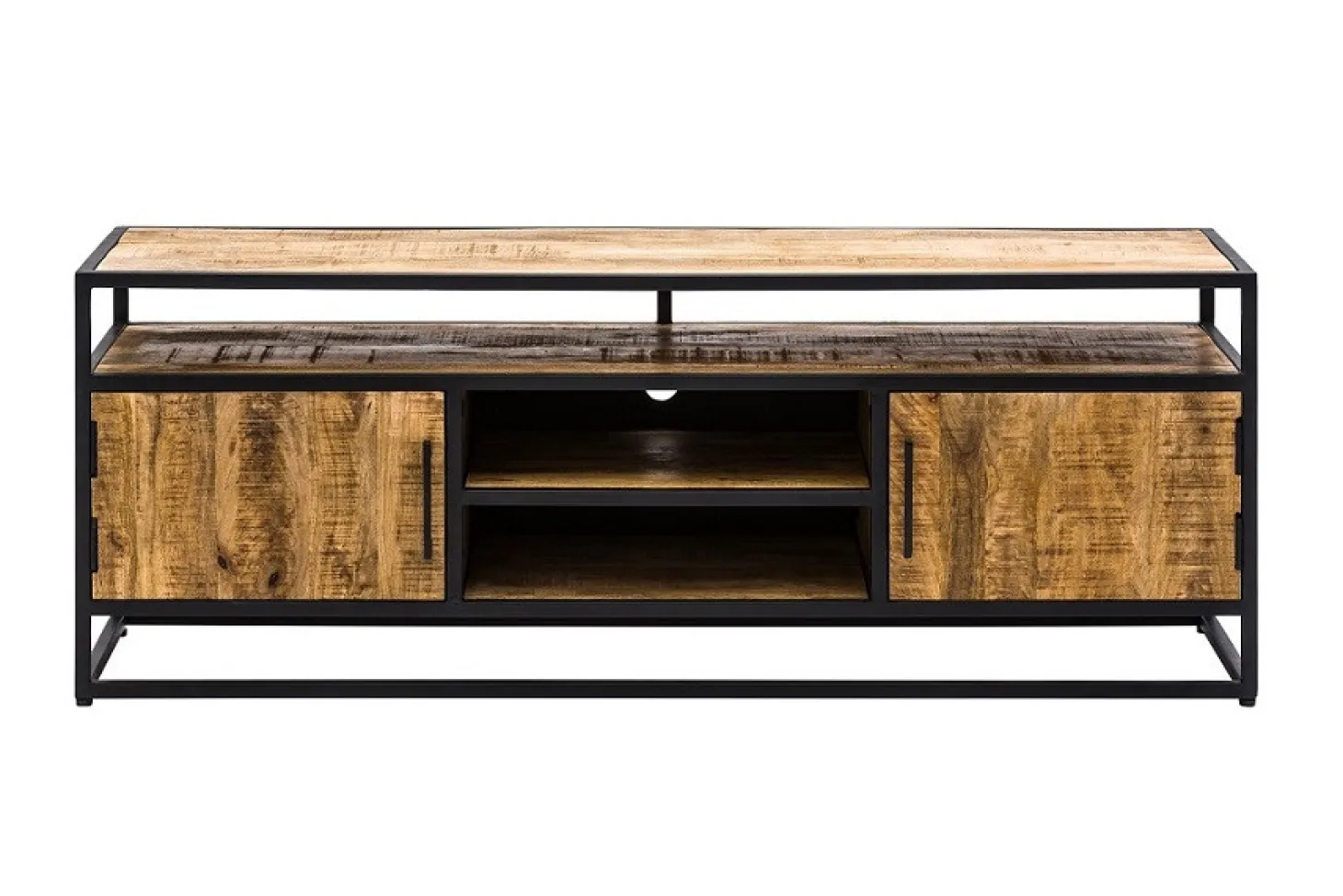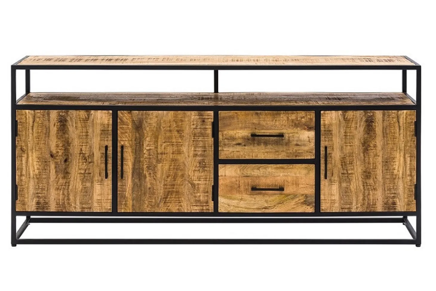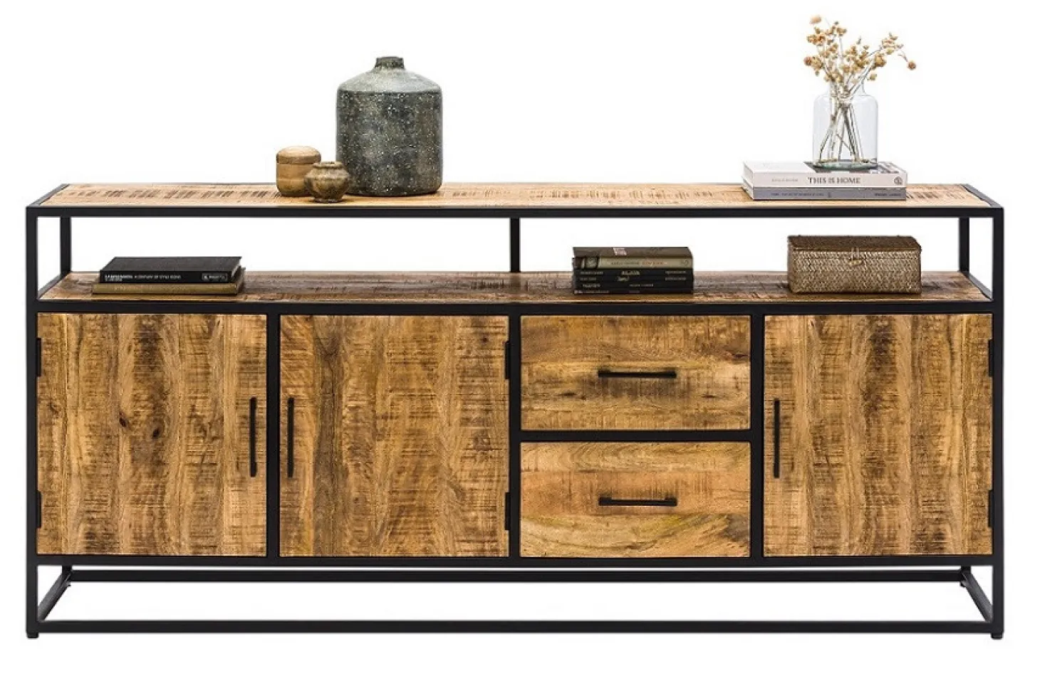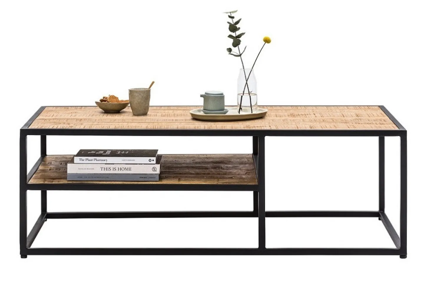 Woonprogramma Eastwood heeft een stoere maar warme industriële uitstraling door de toepassing van mango-hout met strakke zwarte accenten.