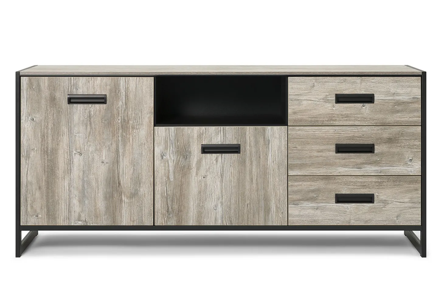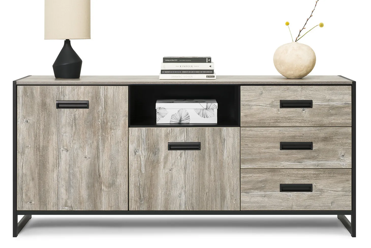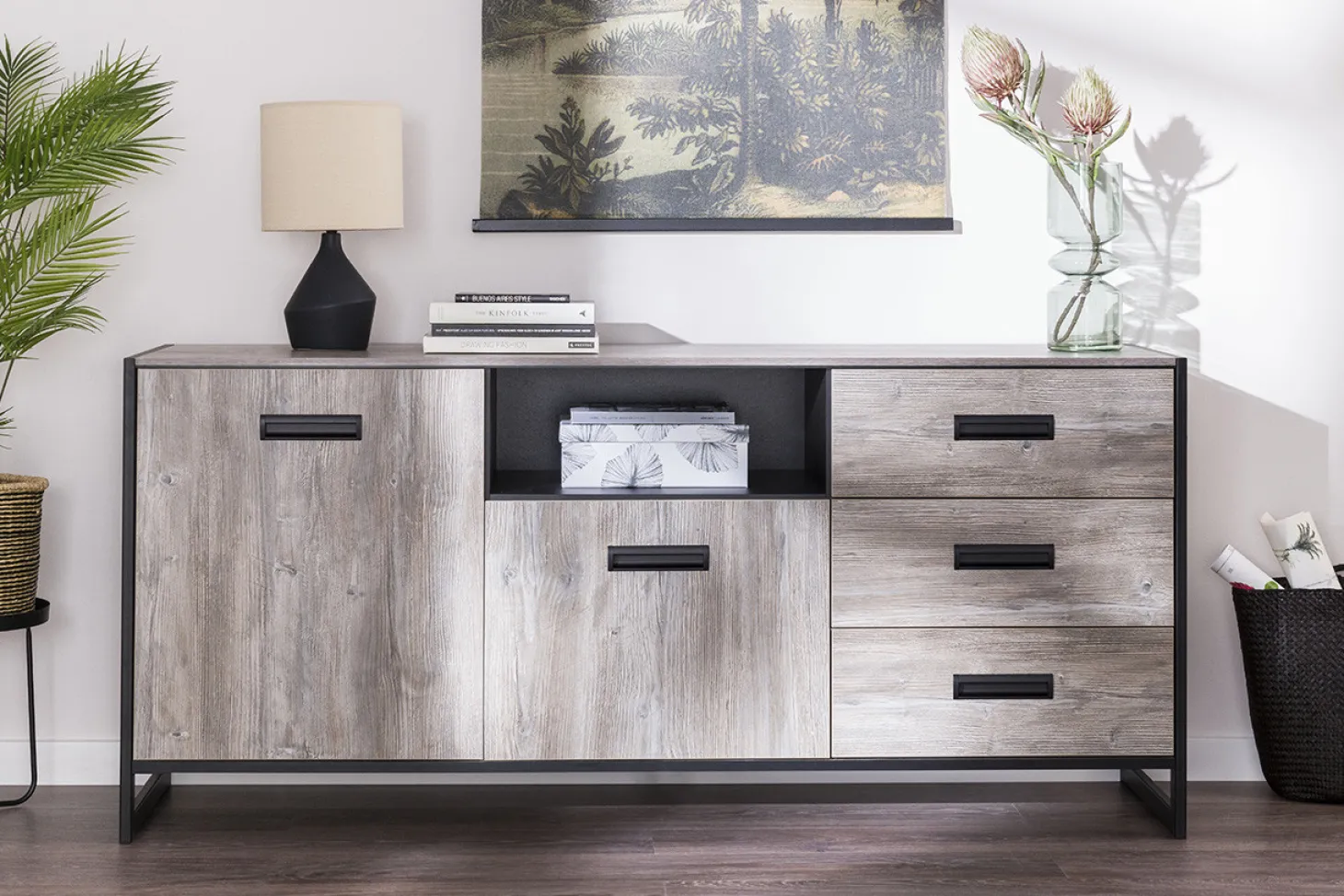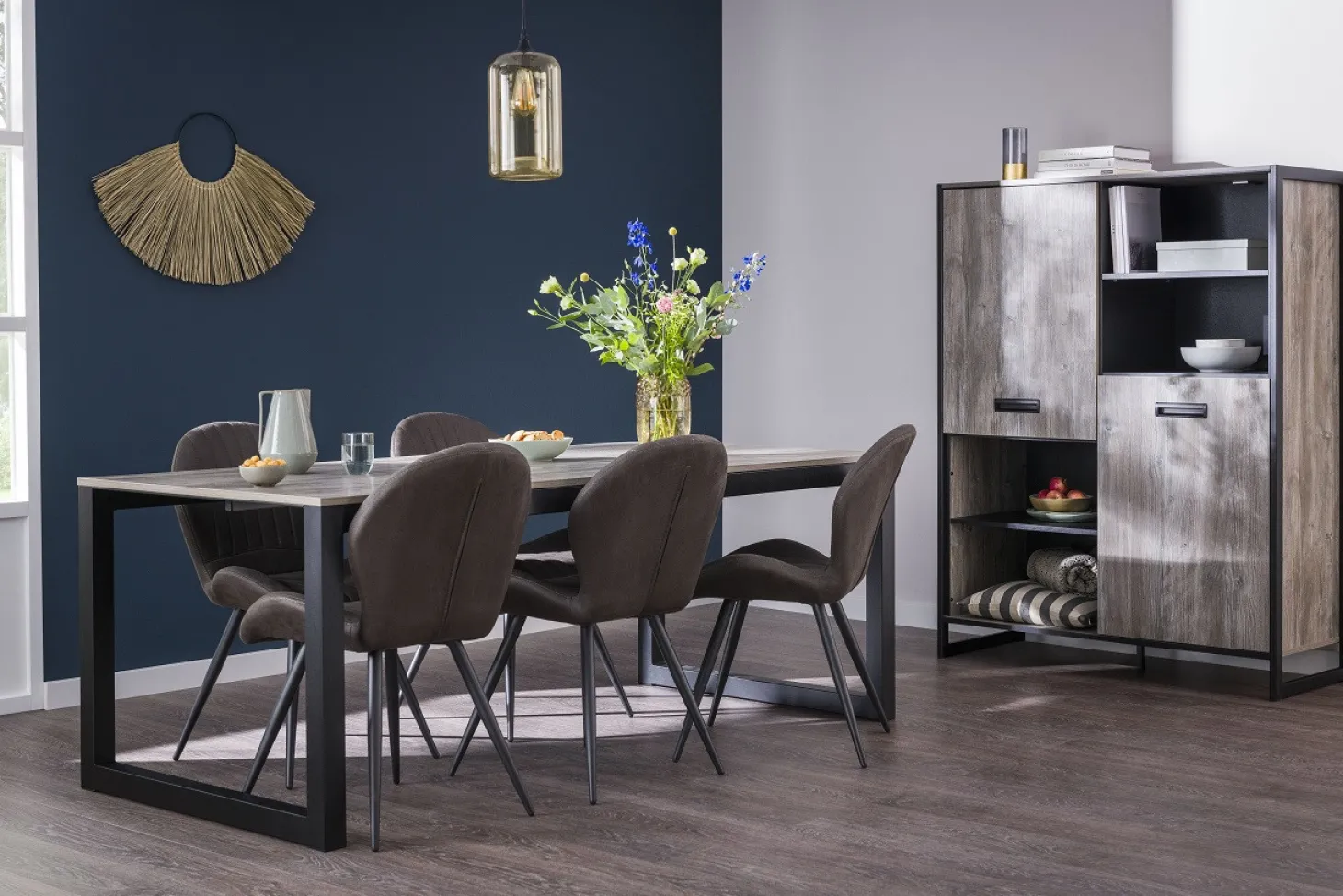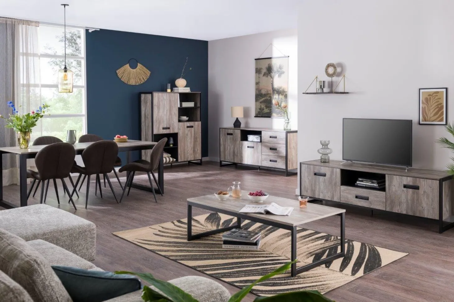 Woonprogramma Factory heeft een industriële vormgeving door strakke lijnen en bijvoorbeeld een zwarte sledepoot, uitgewerkt in graphite oak.