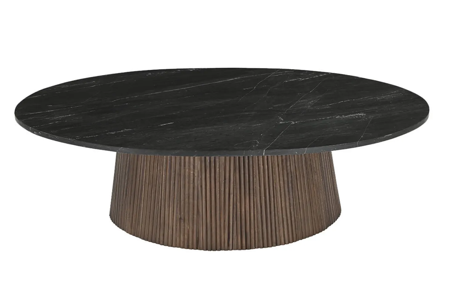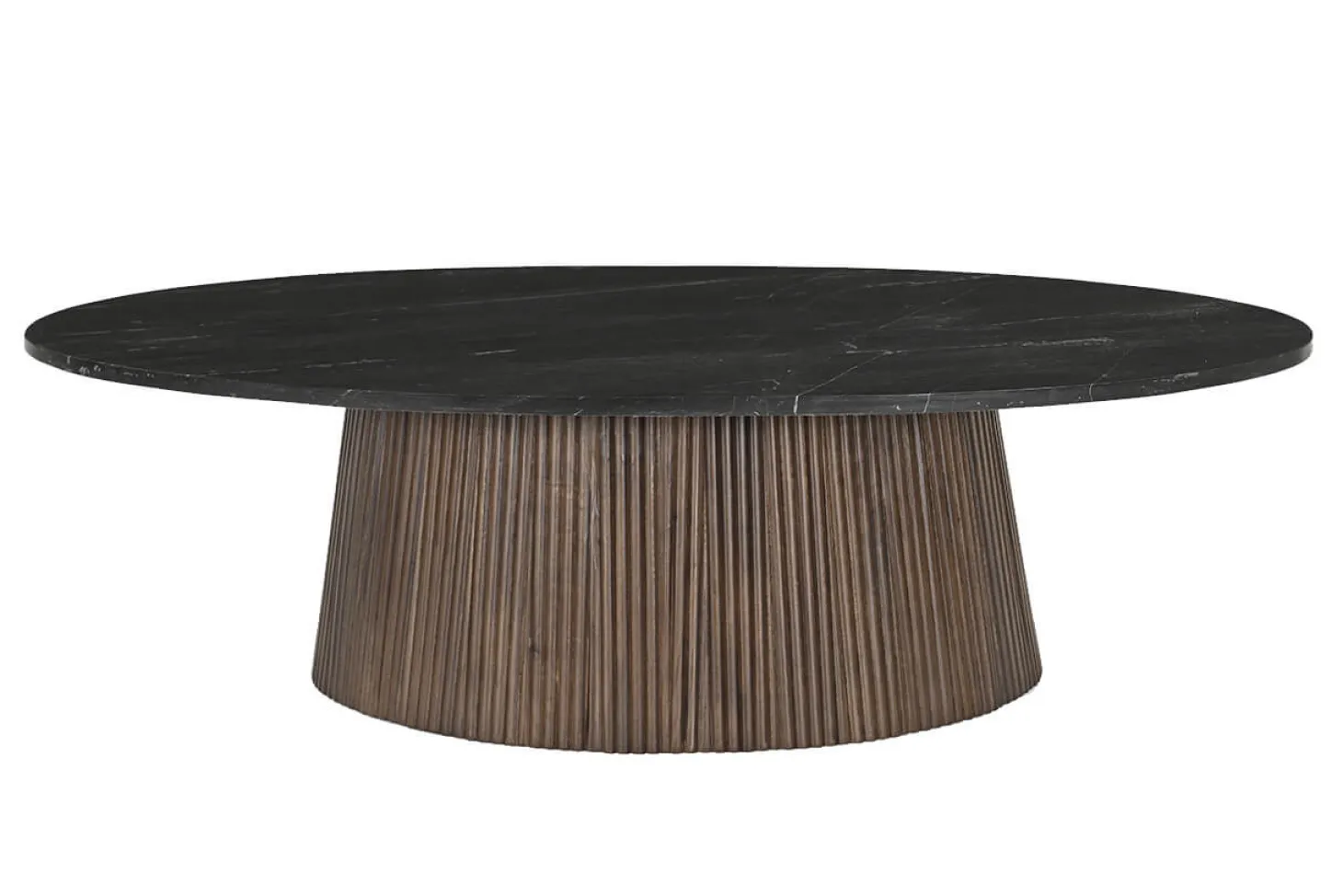 Stijlvolle ovale salontafel met marmer bovenblad en onderstel van mango hout. Uniek en verfijnd ontwerp van hoogwardige kwaliteit. Geheel in Japandi stijl.