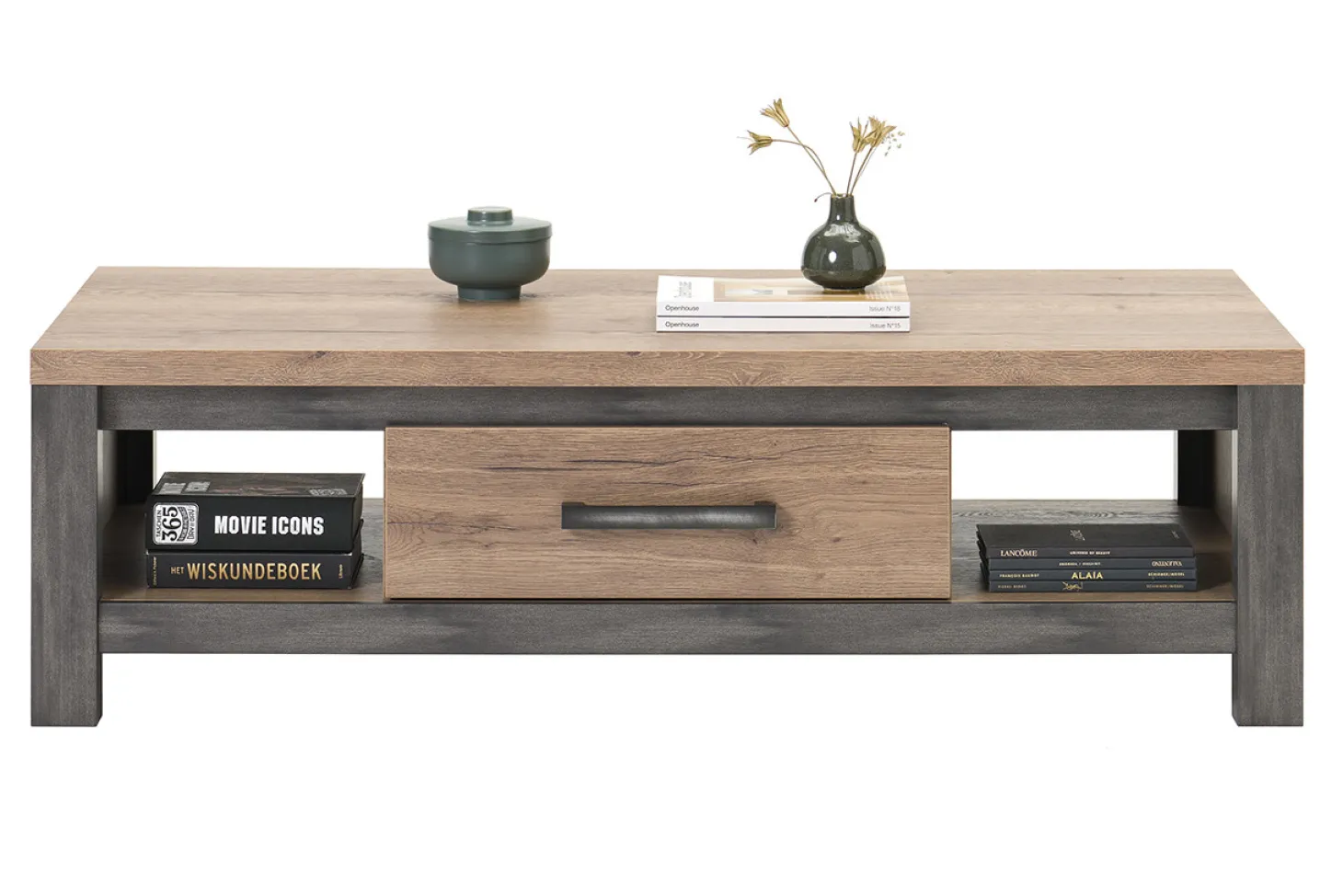 Compleet interieur in kleurstelling industrial tabacco. Dit zit er allemaal bij: TV/Audio/Hifi-Dressoir – Eetkamertafel 190cm recht – Salontafel. Alle items zijn ook los leverbaar.