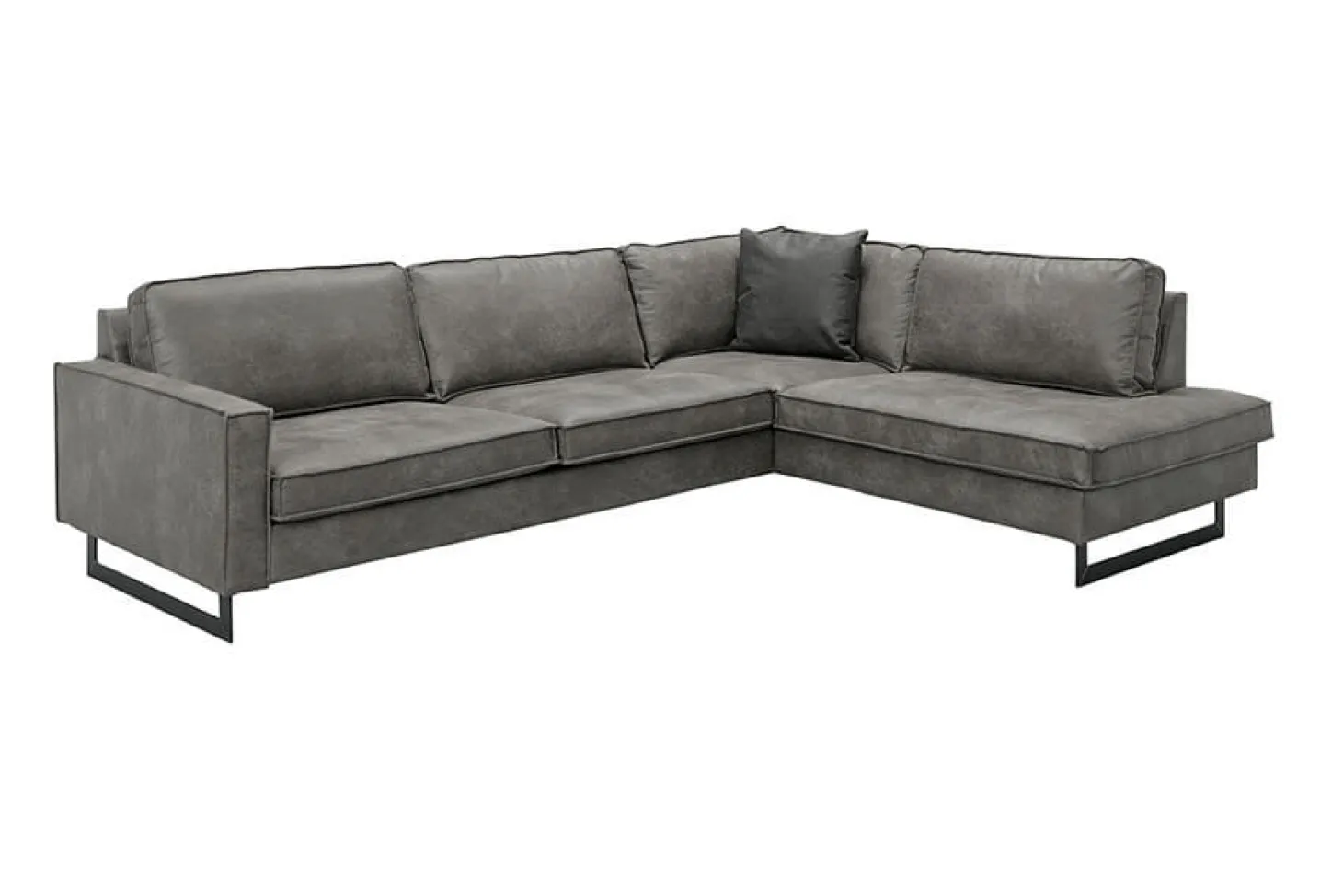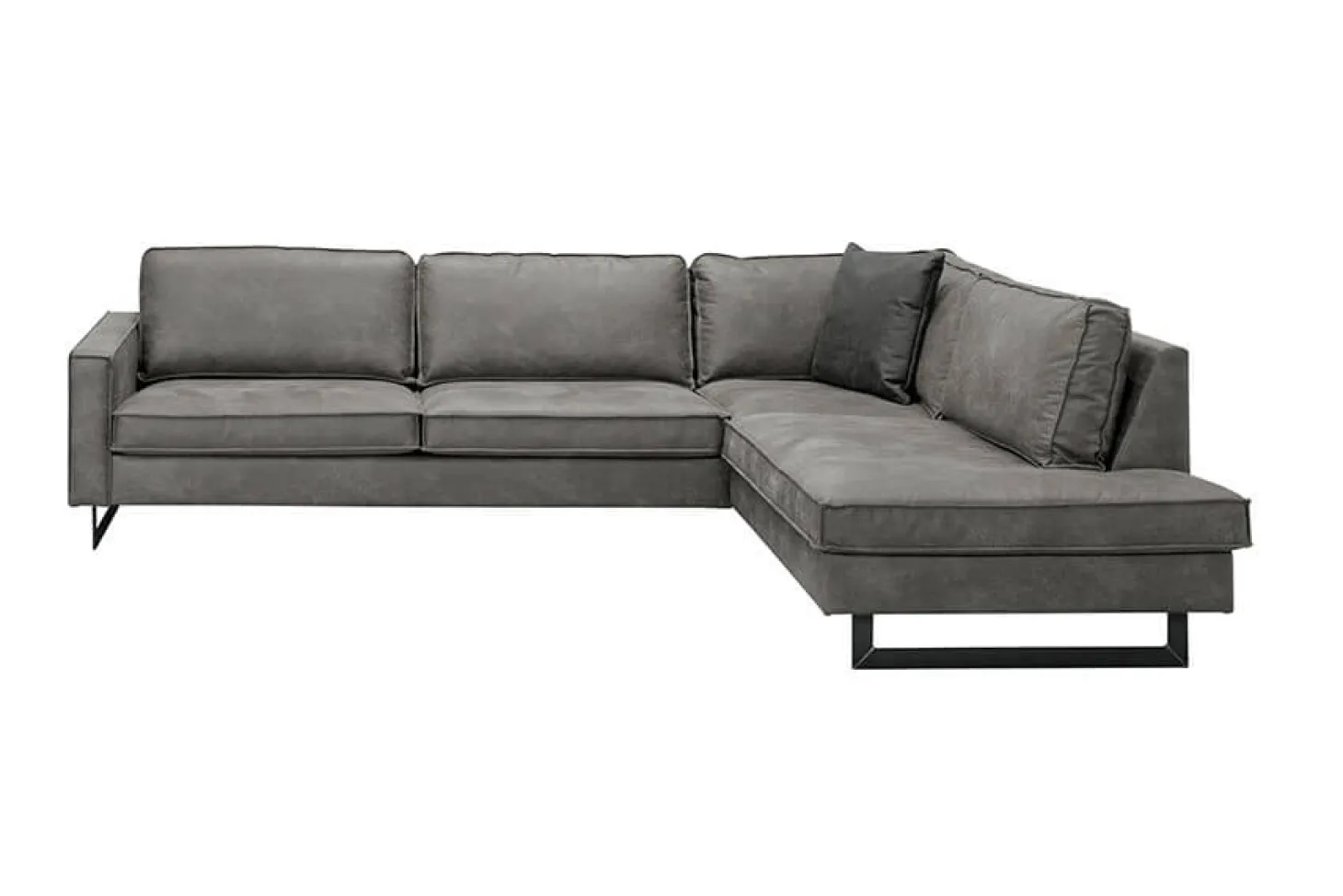 Industriële hoekbank met sledepoot en stoer stiksel. Opstelling kan ook gespiegeld. Diverse kleuren, bekledingen en opstellingen mogelijk. Aanbieding in stof Supreme.