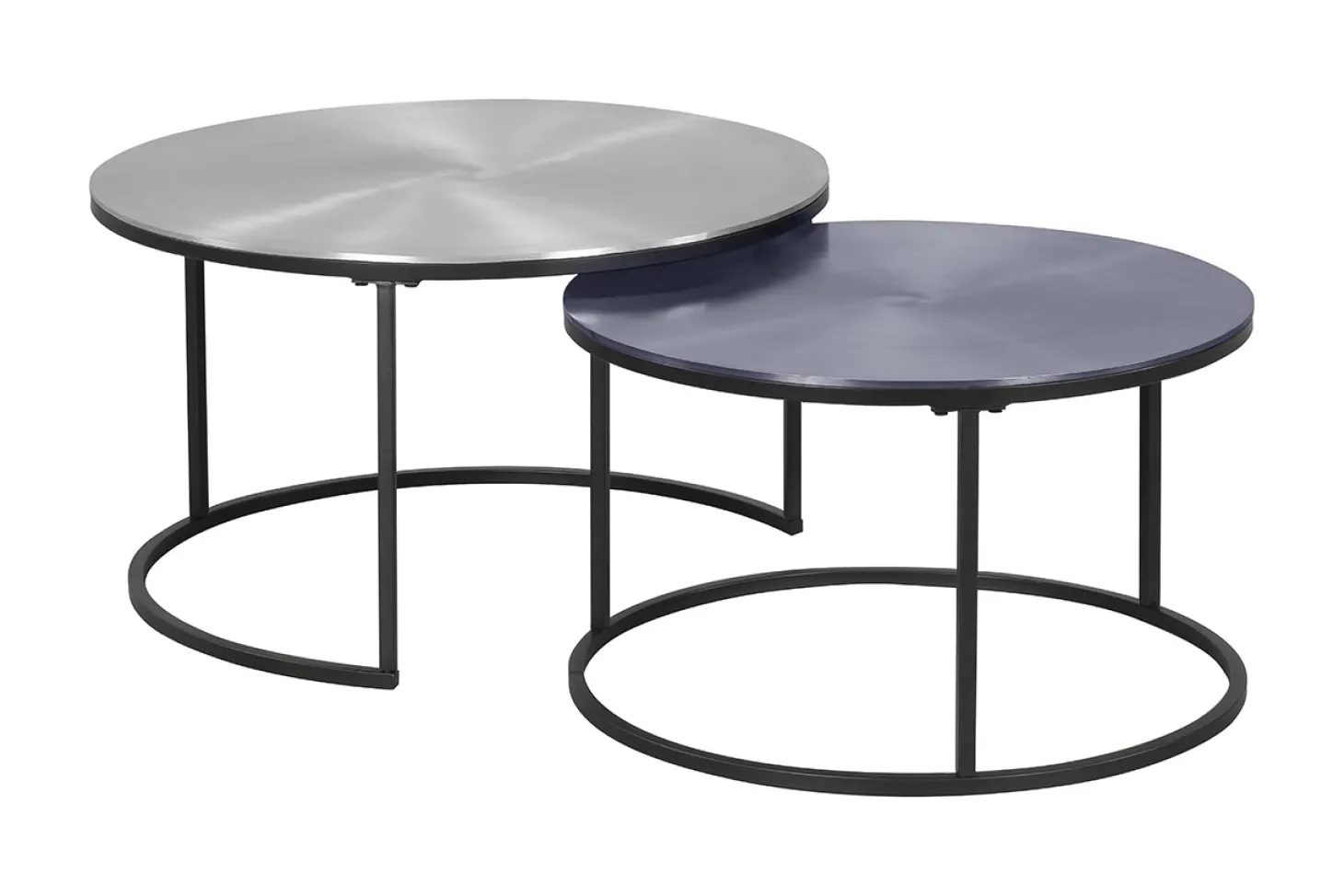 Nice is een eigentijdse set van 2 salontafels die helemaal passen in de industriële woonstijl. De tafels zijn verschillend in hoogte en afgewerkt met een metalen onderstel en aluminium blad, blauw en grijs van kleur. Deze set is leuk als salontafel maar kan ook als bijzettafel gebruikt worden.