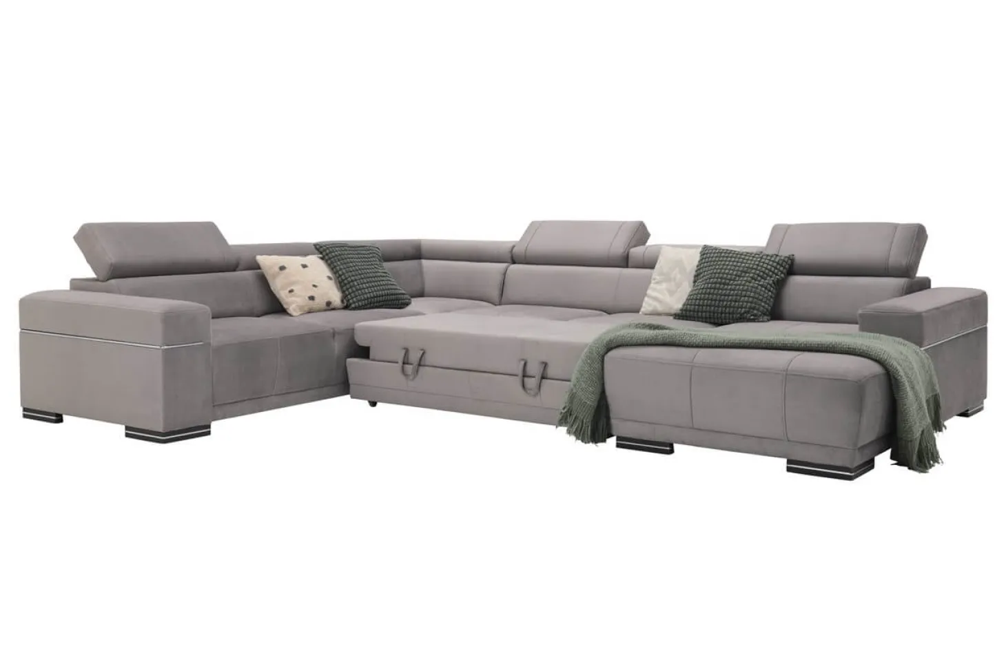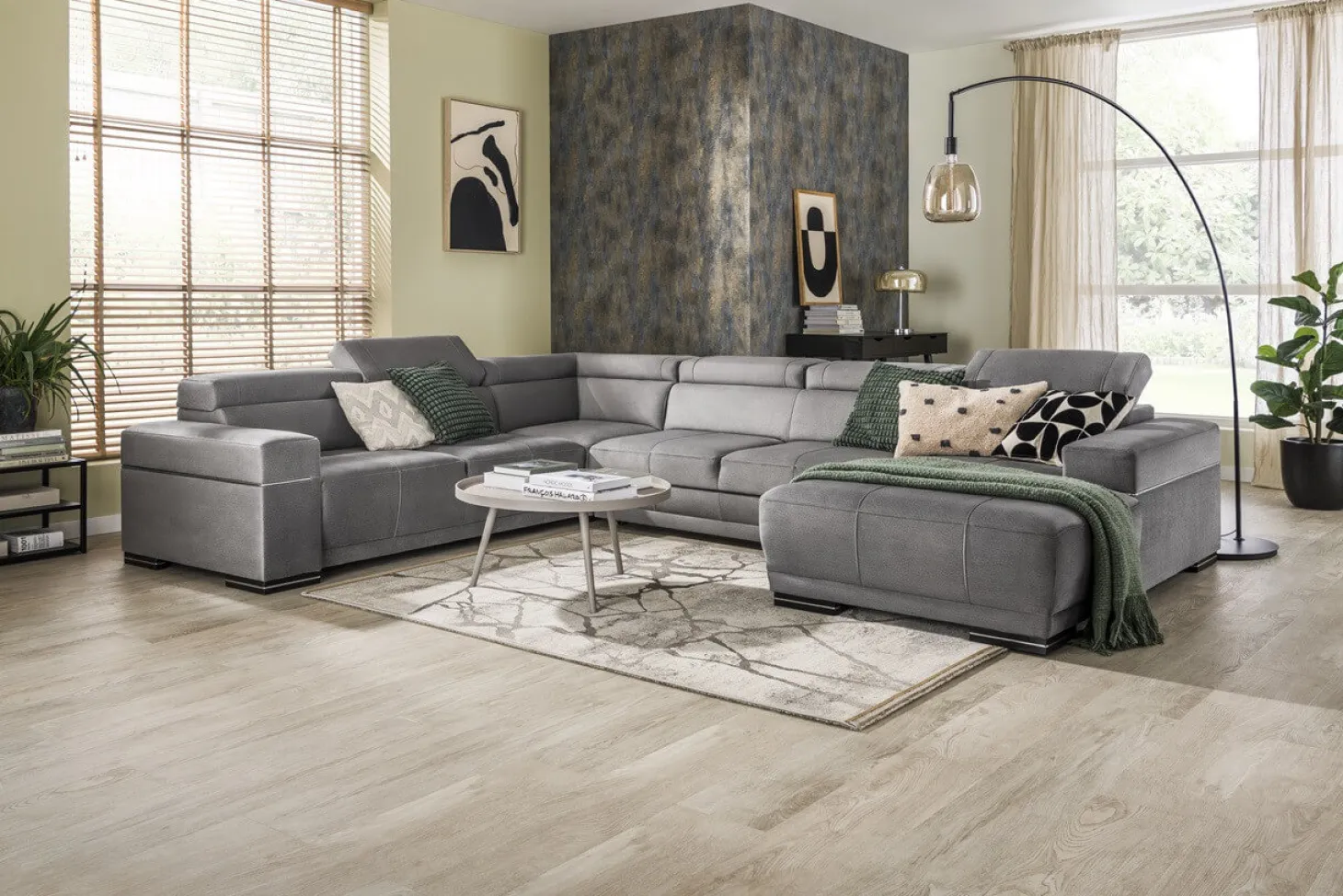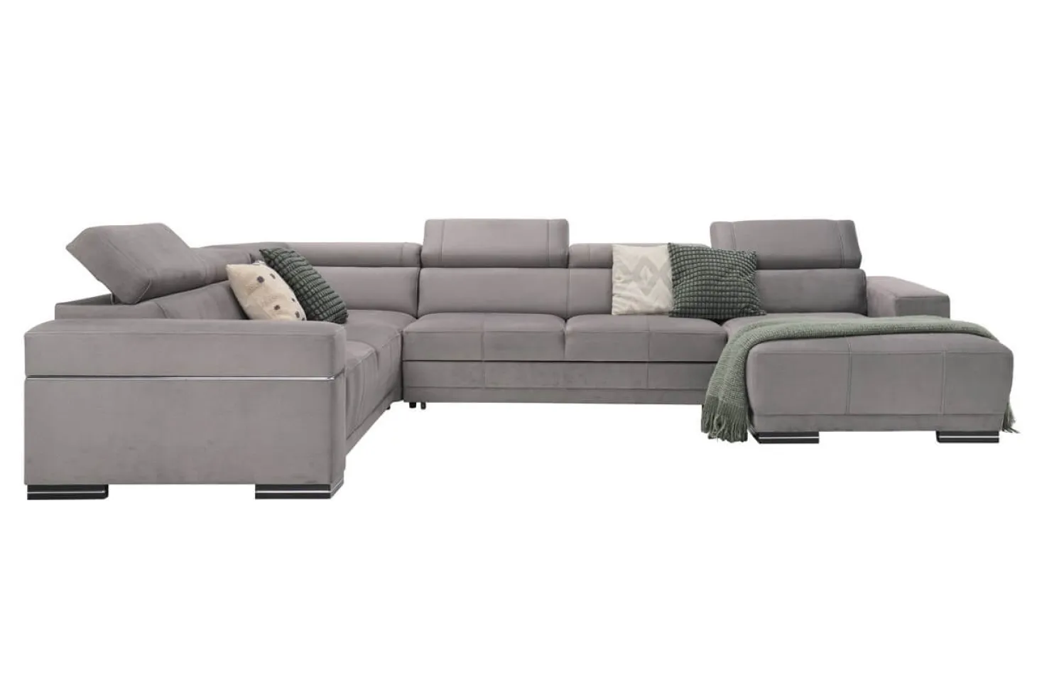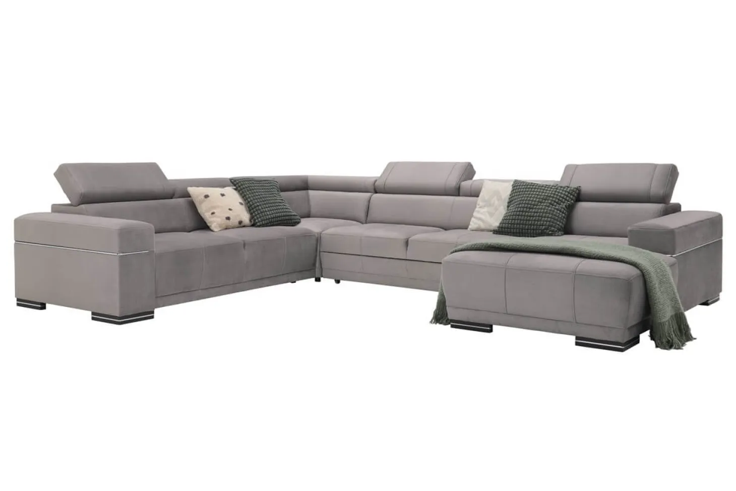 Moderne hoekbank met verstelbare hoofdsteunen en strak design. Als 3+Hoek+3+Longchair in stofcategorie 1. Leverbaar in diverse andere bekledingen, kleuren en opstellingen.