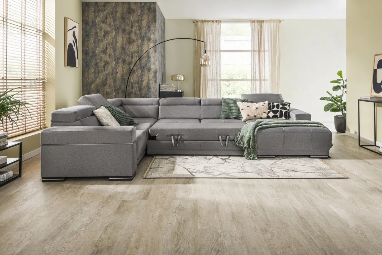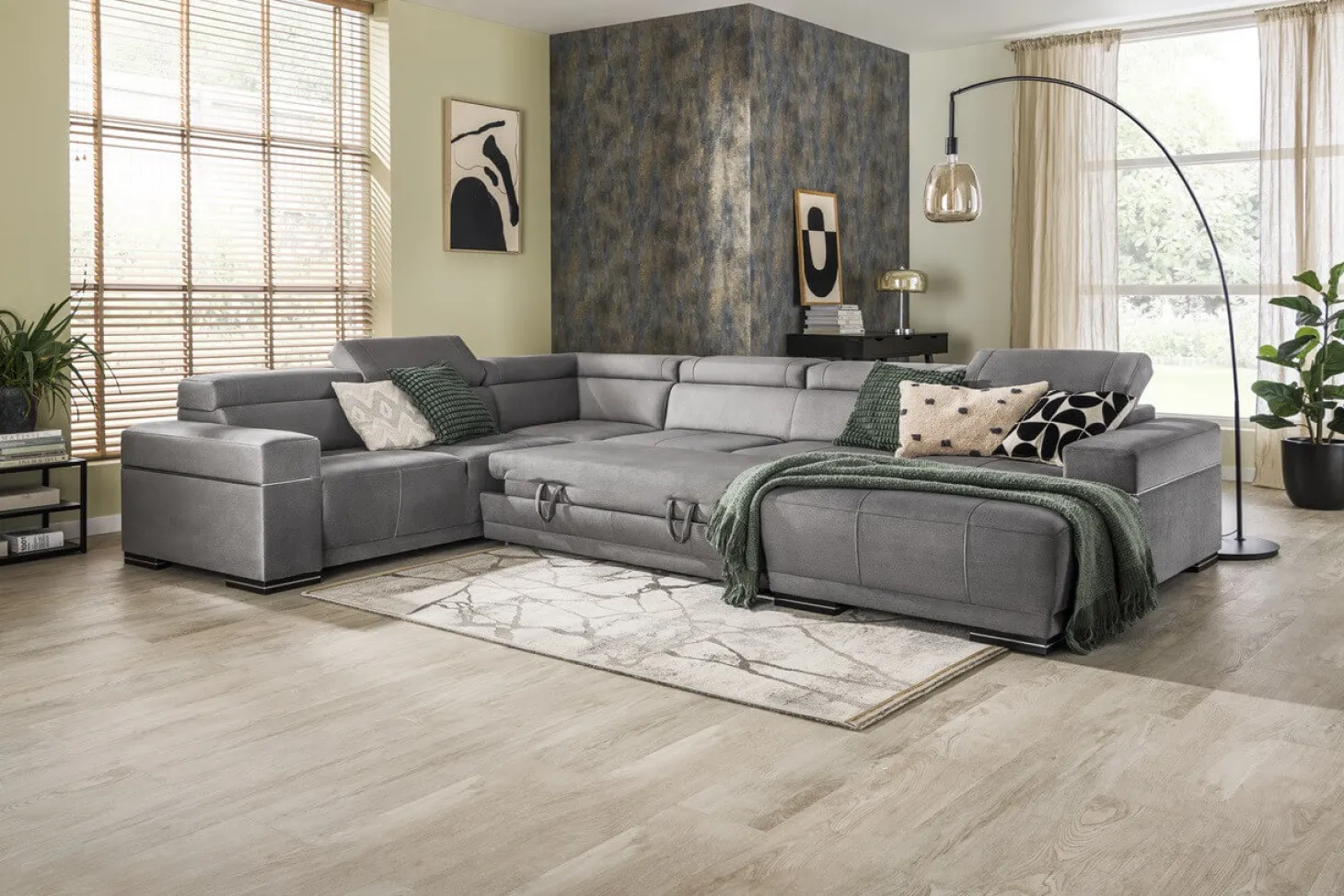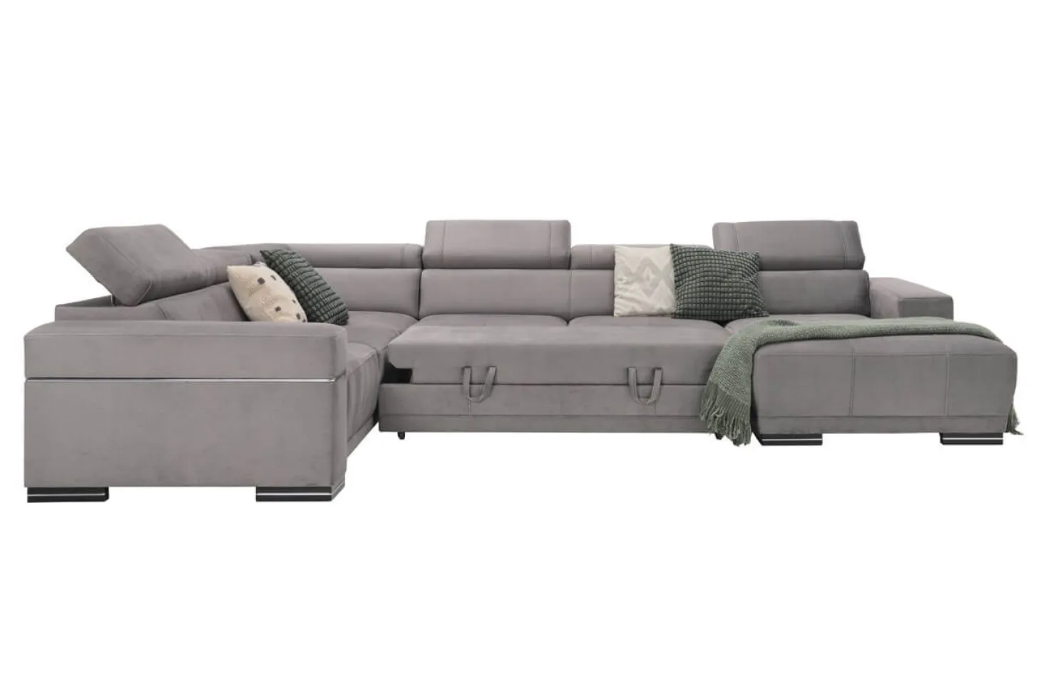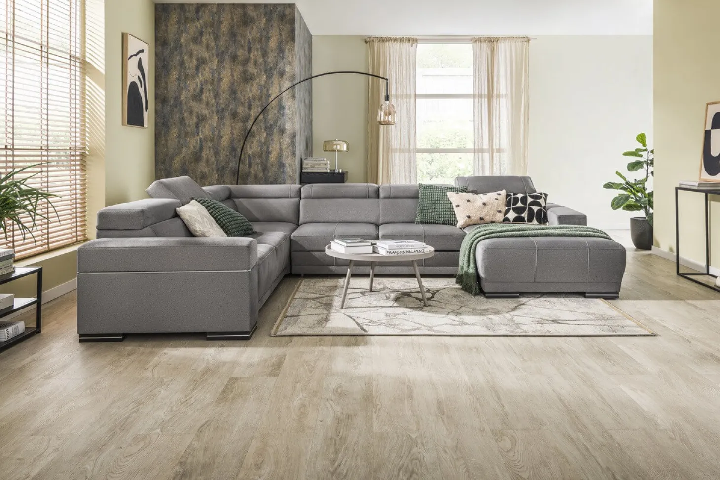 Moderne hoekbank met verstelbare hoofdsteunen en strak design. Als 3+Hoek+3+Longchair in stofcategorie 1. Leverbaar in diverse andere bekledingen, kleuren en opstellingen.