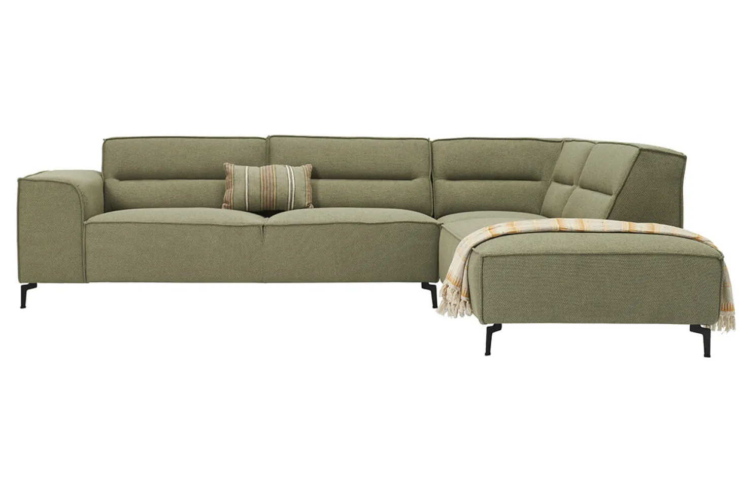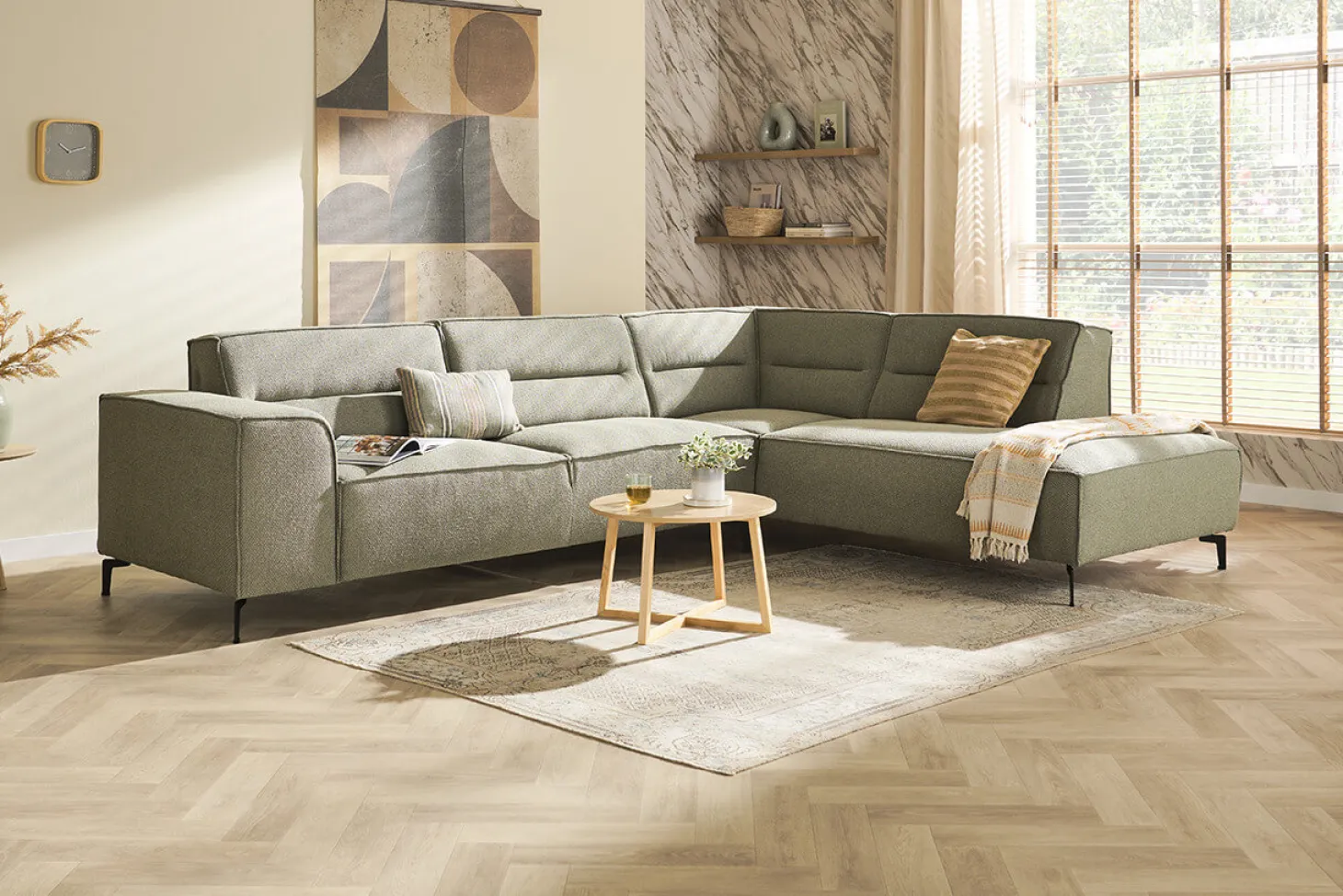 Trendy hoekbank met stoer stiksel en strak afgewerkt design. Ook gespiegeld leverbaar of als kleinere hoekopstelling. Prijs als 3+Hoek+1½-Terminal in stof Atletico.
