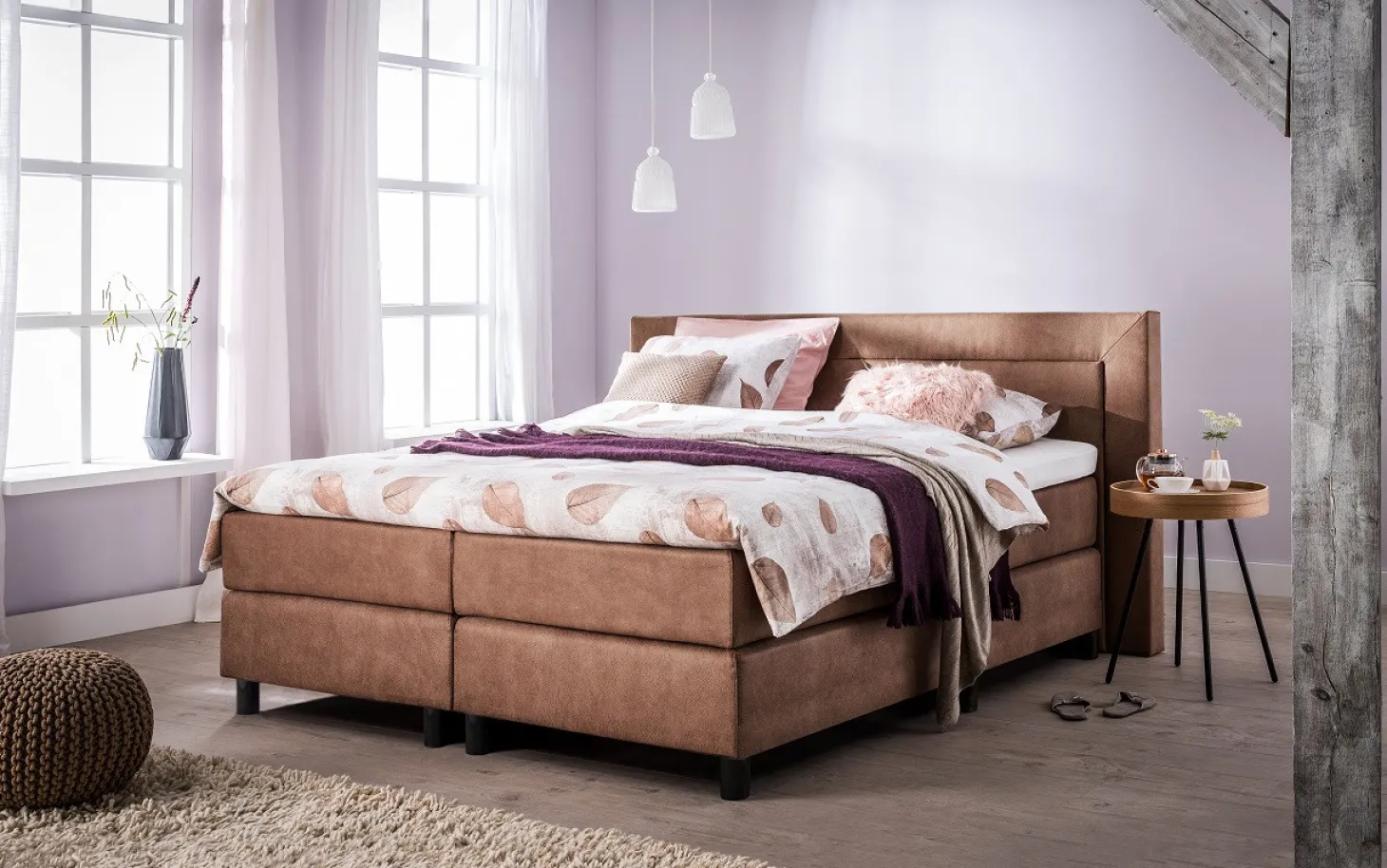 Complete boxspringset • 2-persoons luxe boxspring afgewerkt met zadelstiksel • Luxe boxen met pocketvering – 7 comfortzones • Luxe matrassen met pocketvering – 7 comfortzones en comfortschuim afdeklaag • Inclusief luxe hoofdbord, afgewerkt met design bies • Inclusief potenset Cilo Black Metal • Dit model is helemaal compleet & meegestoffeerd.