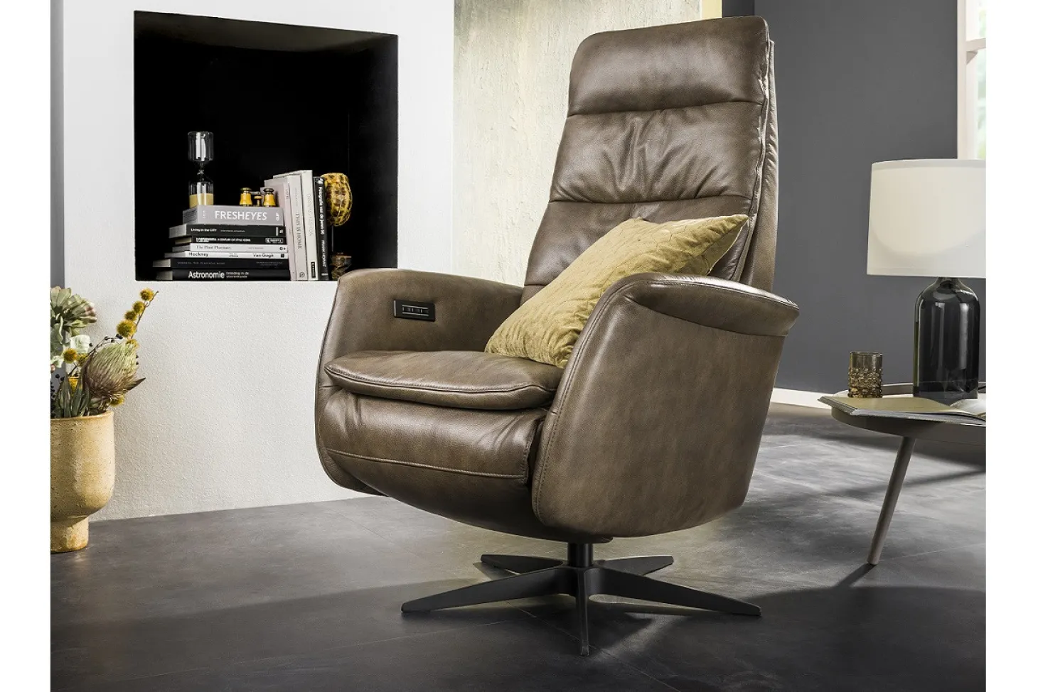 Design-relaxfauteuil van hoge kwaliteit met stoere uitstraling en stervoet. Volledig elektrisch met 3 motoren en accu. Prijs is op basis van goedkoopst beschikbare uitvoering. Uitvoering en beschikbaarheid kan per vestiging verschillen.
